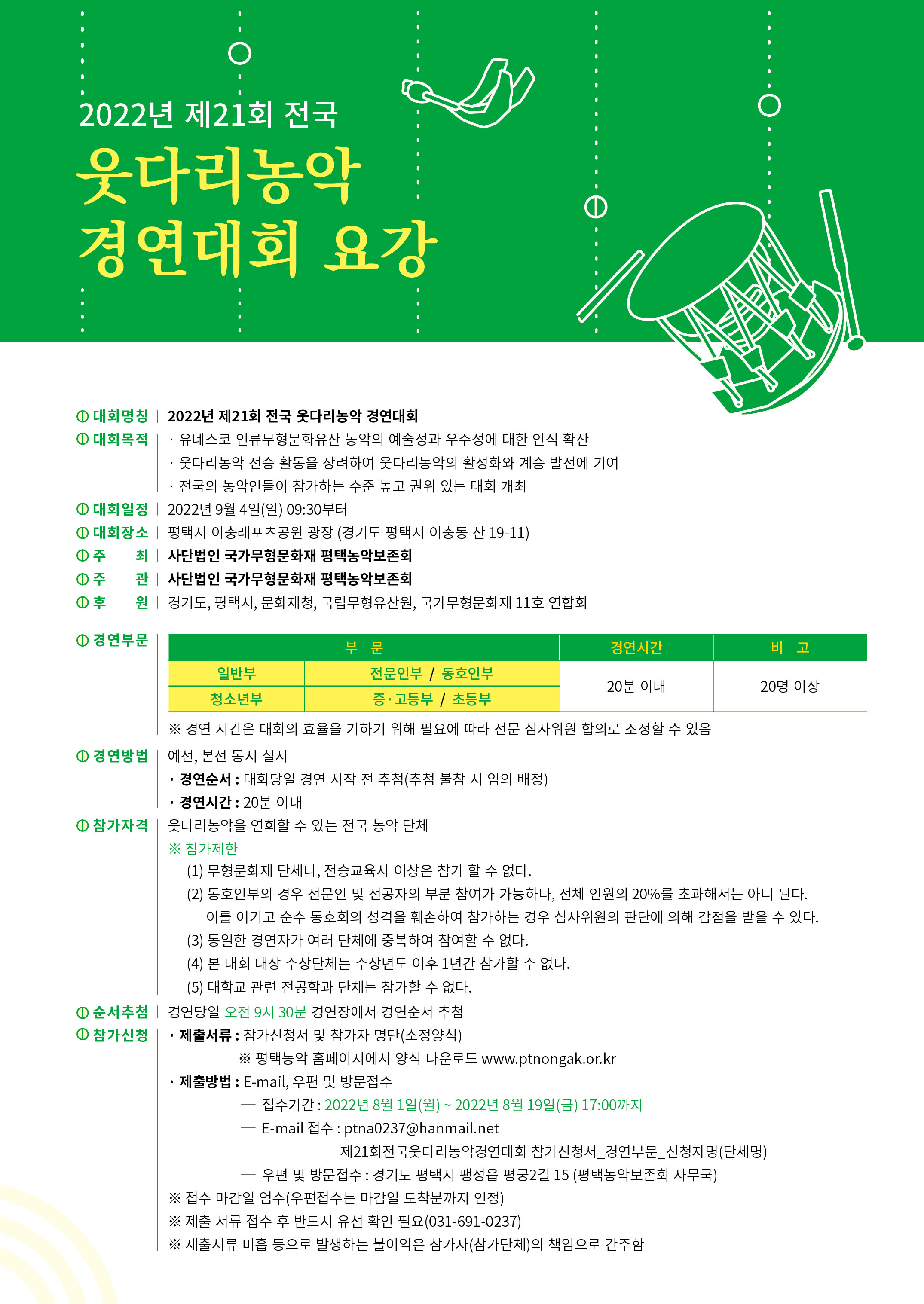 2022년 제21회 전국 웃다리농악 경연대회 작성자평택농악보존회|작성시간22.08.10|조회수26 목록 댓글 0 글자크기 작게가 글자크기 크게가 홈페이지 : www.ptnongak.or.kr 다음검색 현재 게시글 추가 기능 열기 북마크 공유하기 신고 센터로 신고 댓글 댓글 0 댓글쓰기 답글쓰기 댓글 리스트