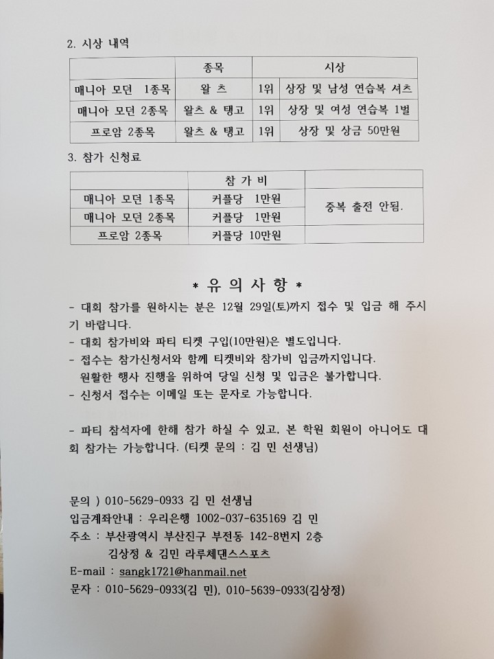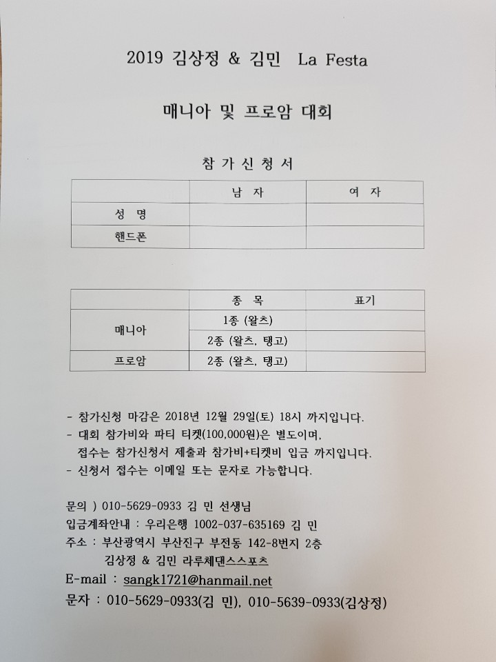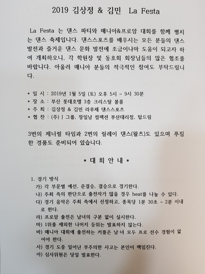 [스크랩] 김상정&김민 라루체댄스스포츠//댄스파티및 매니아&프로암대회2019.1.5(토)5:00 부산 롯데호텔(크리스탈볼룸)