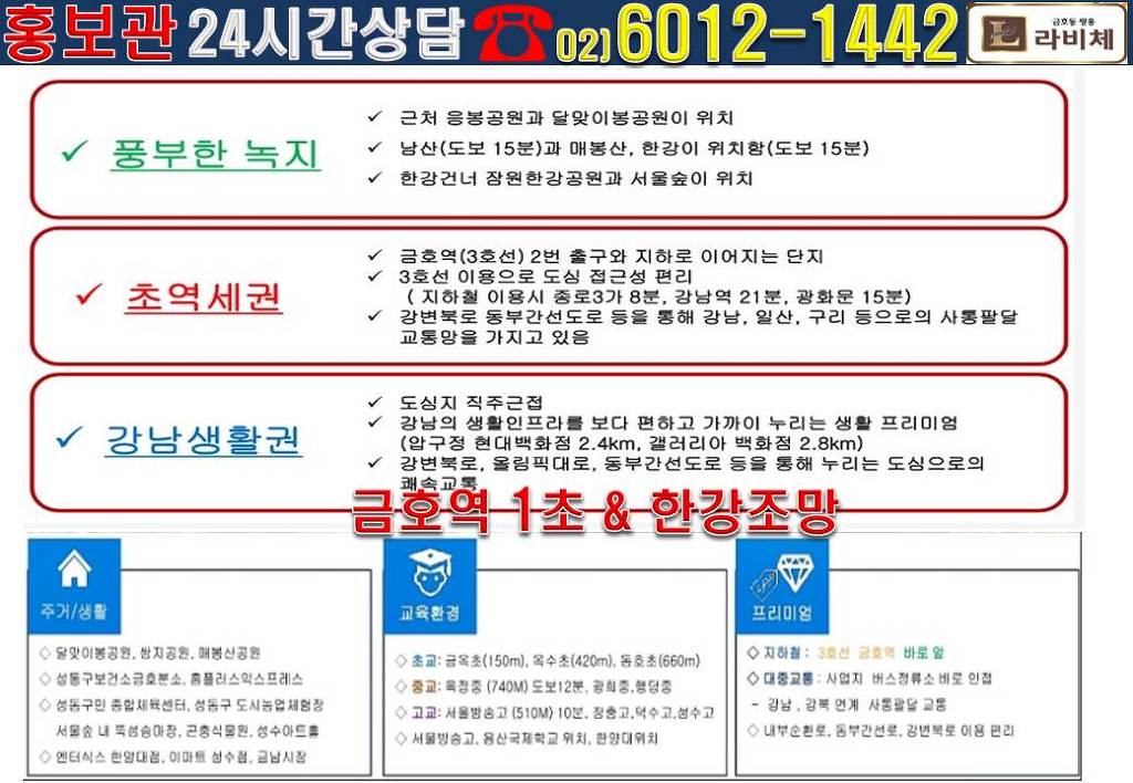 금호동 쌍용라비체는 우수한 교육환경과 주변공원 및 남산으로 이어지는 풍부한 녹지, 금호역과 강변북로 등 강남생활권을 누릴 수 있는 교통환경 그리고, 전용 85㎡ 이하 설계와 합리적인 공급가로 소비자들의 마음을 움직이고 있다.