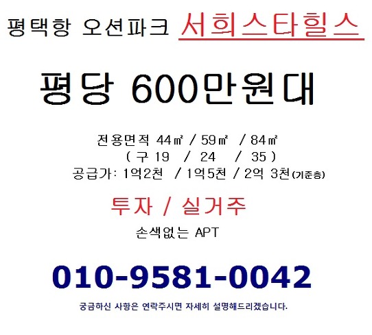 평택 1800세대 대단지 아파트 서희스타힐스 평당 600만원대 / 같은물건이라도 누구한테 상담받느냐가 중요합니다.