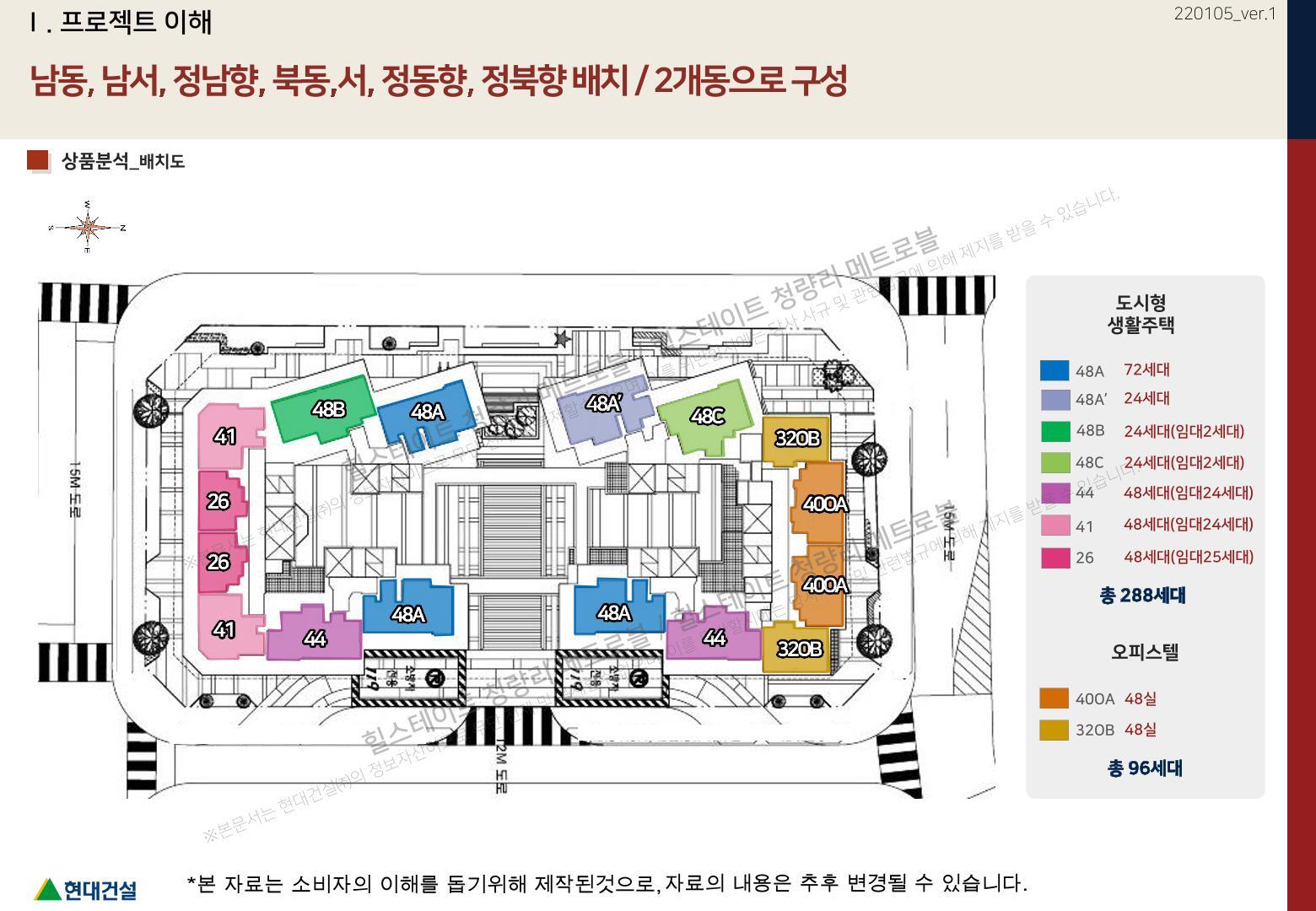 방향으로는 남동, 남서, 정남향, 북동, 서, 정동향, 정북향으로 배치, 2개동으로 구성될 예정입니다.
