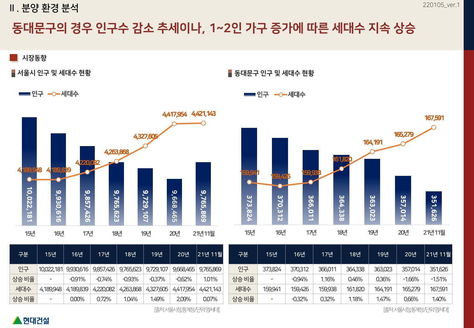 동대문구의 경우 1~2인 가구 증가에 따른 세대수가 지속적으로 상승하고 있습니다.