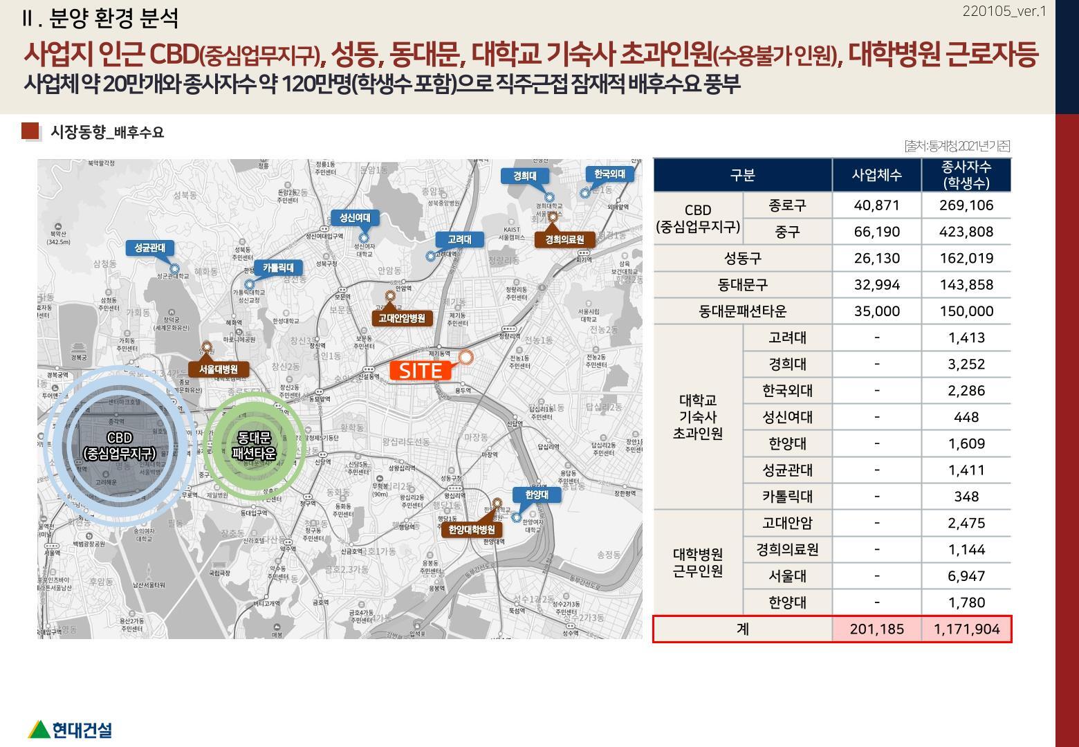 CBD(중심업무지구)권역 및 동대문종합시장 권역, 인근 대학병원의 직주근접 임대수요와 주변 7개 대학의 잠재적 풍부한 임대수요가 있습니다.