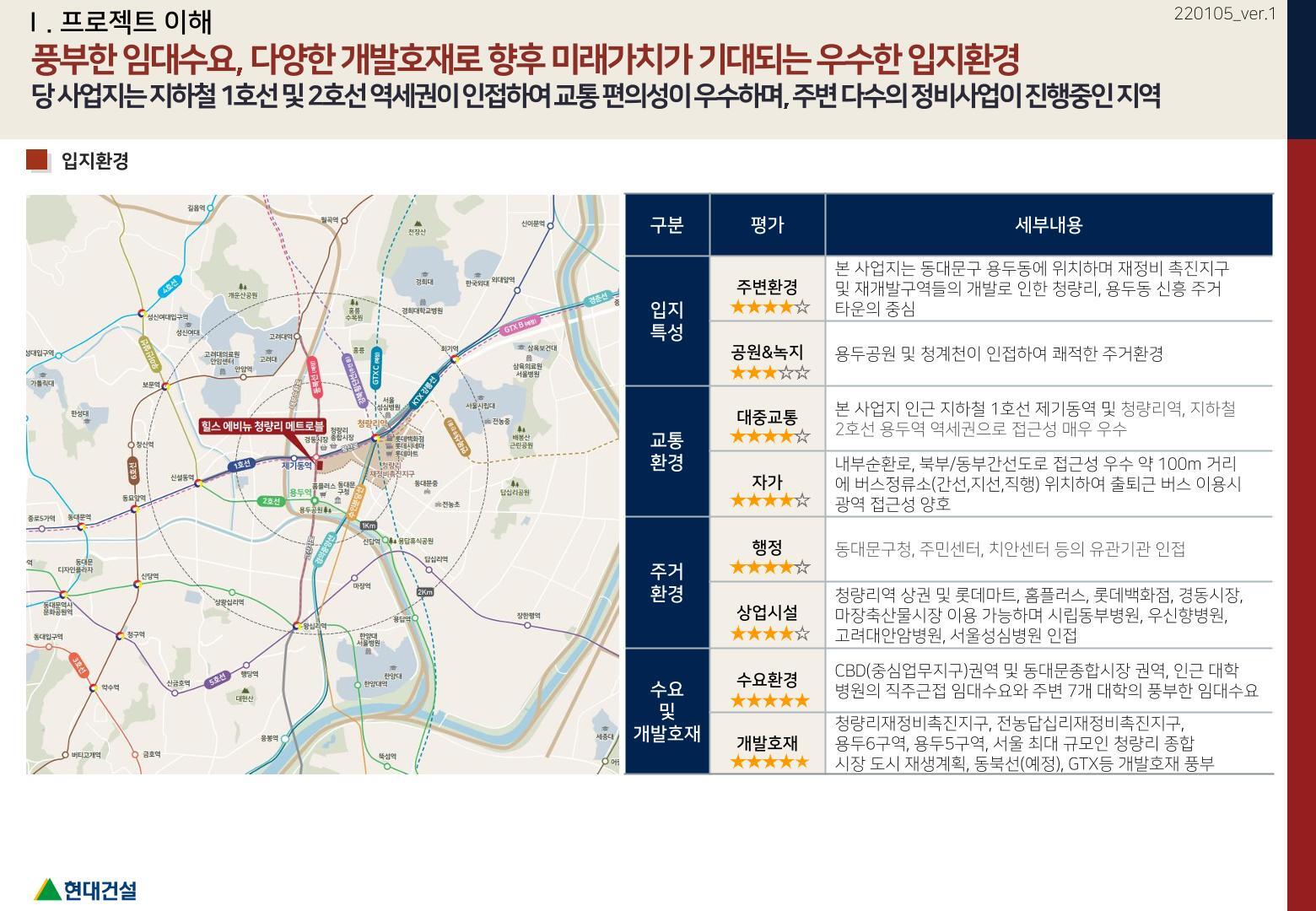 당 사업지 인근에는 용두공원 및 청계천이 인접되어 쾌적한 산책로의 주거환경과 제기동역 및 청량리역, 용두역 역세권으로 접근성이 매우 우수합니다. 내부순환로, 북부/동부 간선도로 접근성도 우수하여 약 100m 거리에 버스정류소(간선, 지선, 직행) 위치하여 출퇴근 버스 이용시 광역 접근성도 양호합니다.
