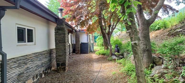 시골 강가를 걸어 올라오면 옛향기 물씬나는 한옥 스타일 개방 담장