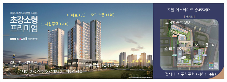 "지웰 에스테이트" 외대앞역 바로앞에 위치하고, 약1,600평의 대지, 20층규모 총3개동,총455세대로서 지상1~2층 생활편의시설 입점, 2층 의료시설 및 입주자를 위한 편의시설 휘트니스, 카페, 도서관 등 커뮤니트시설 및 사물인터넷을 도입하여 편리한 주거생할을 할 수 있는 "원스톱라이프 시스템"을 갖추고있습니다.