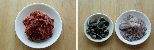 쇠고기 200g(불고기감), 낙지 2마리, 모시조개 200g, 양파 150g, 배춧잎 3장,