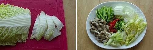 배춧잎은 결반대로 한입크기로 자르고, 양파도 약간 굵직하게 채 썬다