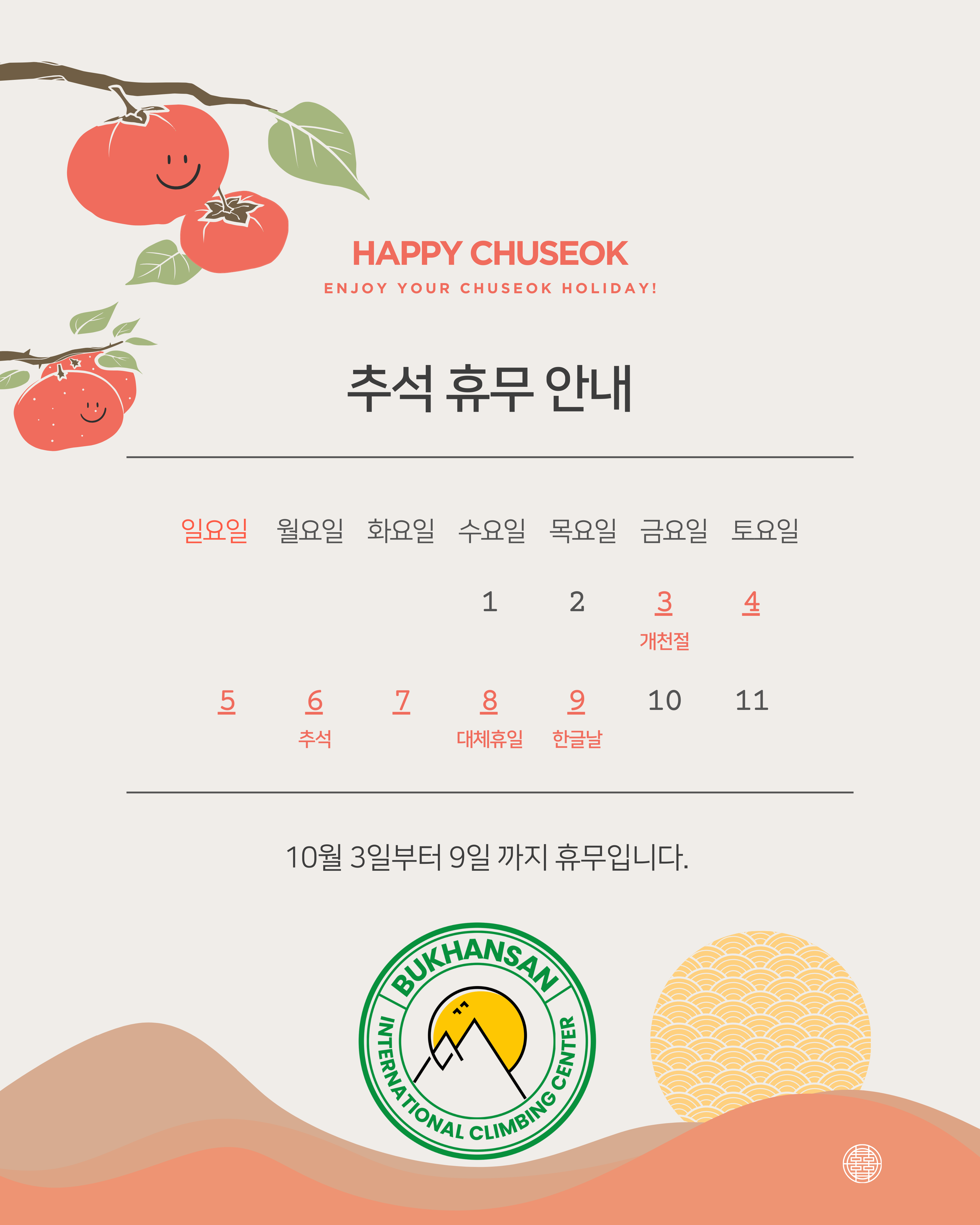 10월 3일 부터 9일까지 휴무입니다.