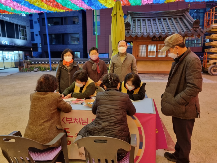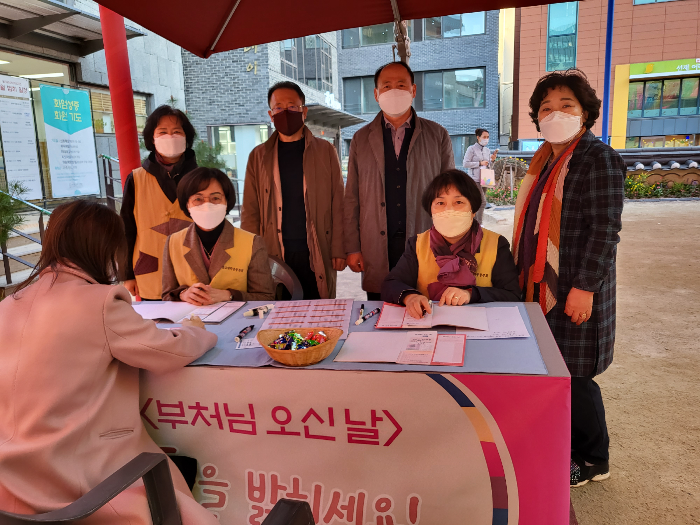 4월 첫째날 총동문회는 조계사 청정도량에 발걸음 하시는 불자님들께 불을 밝힐 수 있도록 권선하는 봉사를 하였다.