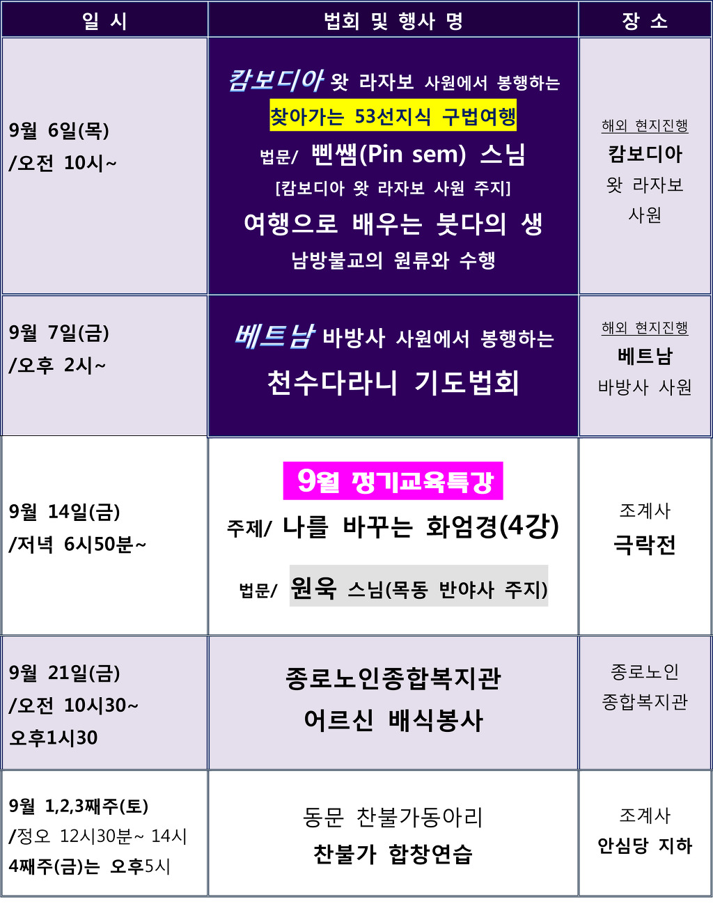 위 9월 법회 및 봉사(행사) 일정표를 참조하시여