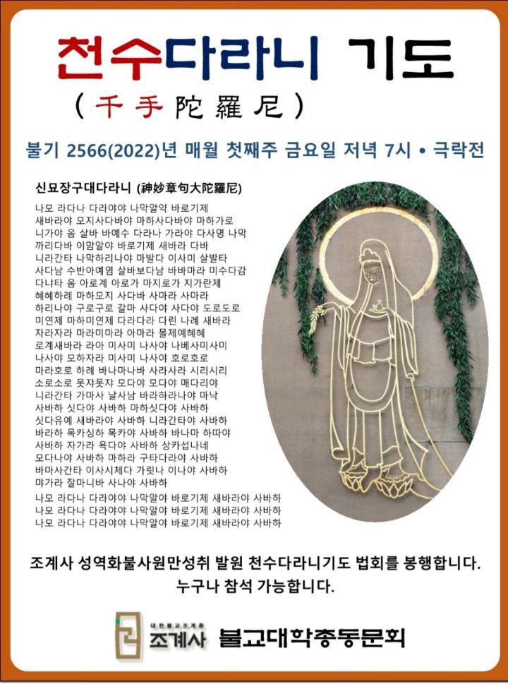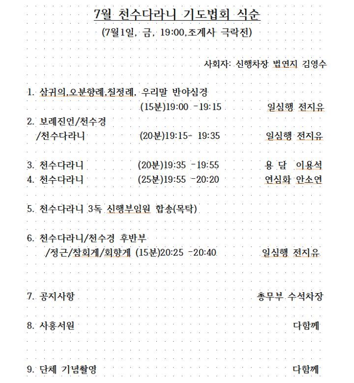 2022년 7월1주차 천수다라니법회 작성자정은희문수행|작성시간22.06.28|조회수67 목록 댓글 0 글자크기 작게가 글자크기 크게가 천수다라니기도 법회행사 봉행합니다.시간:저녁 7시장소: 극락전 동문님들의 많은 동참바랍니다. 다음검색 현재 게시글 추가 기능 열기 북마크 신고 센터로 신고 댓글 댓글 0 댓글쓰기 답글쓰기 댓글 리스트