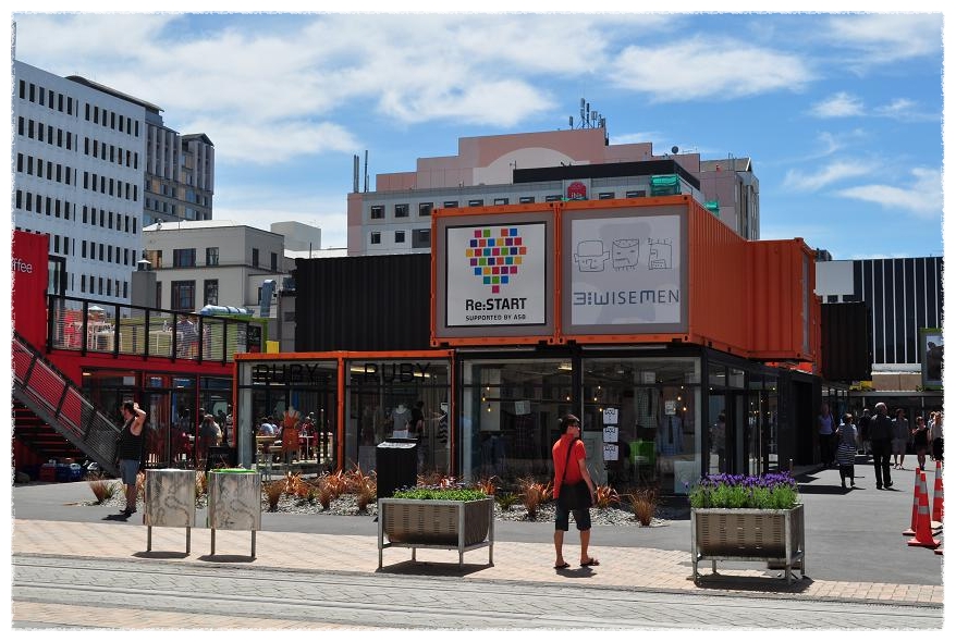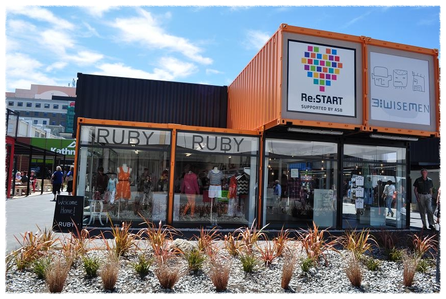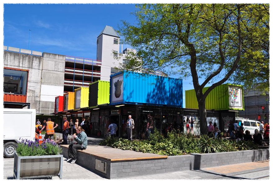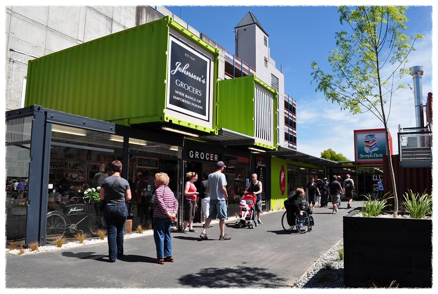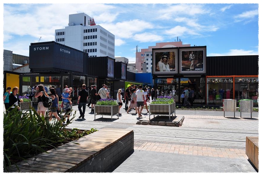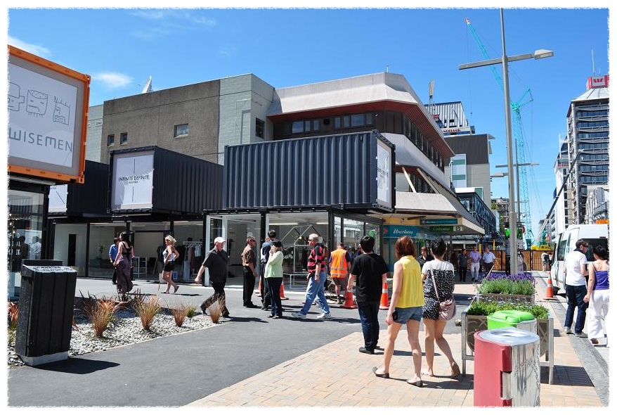 지진의 흔적없이 깨끗이 정리된 거리에 새로이 설치된 컨테이너 상점들은