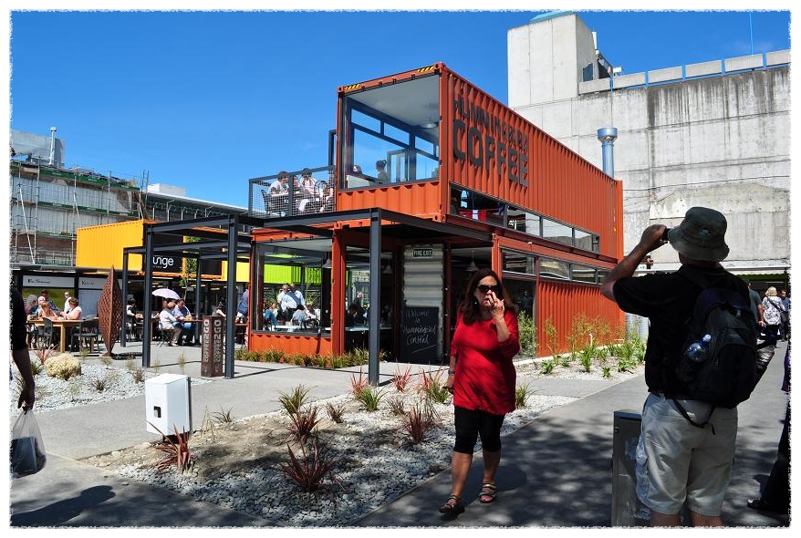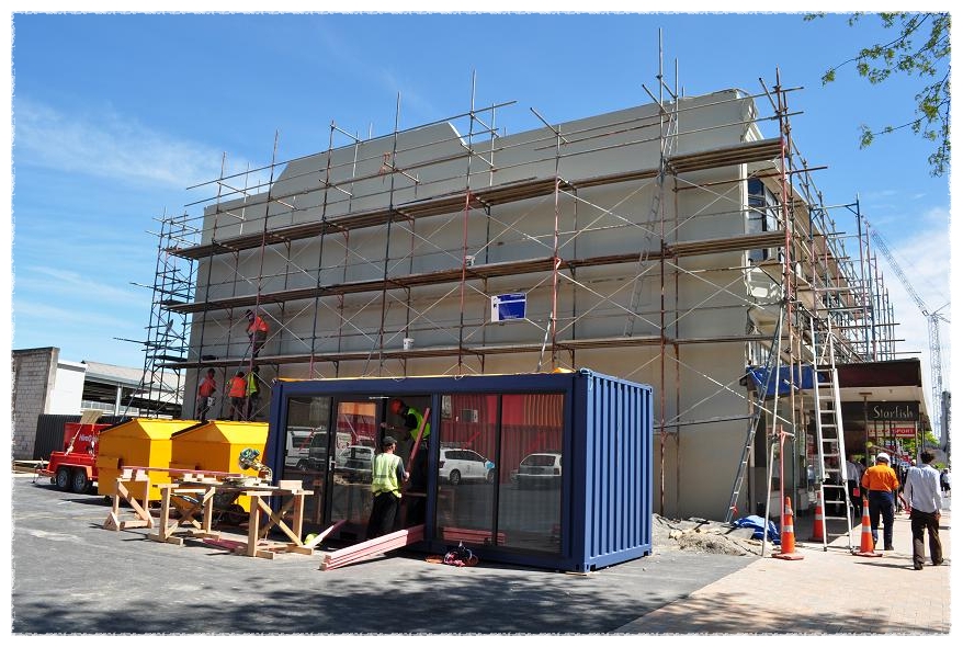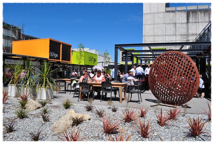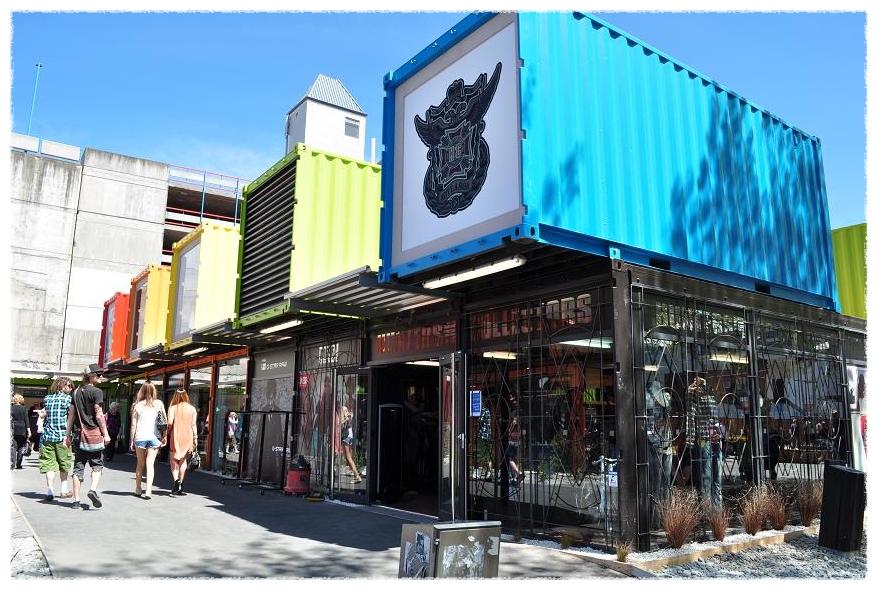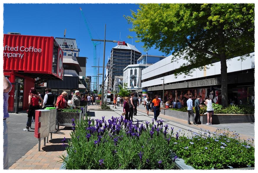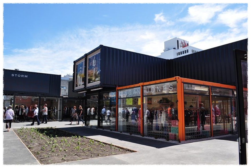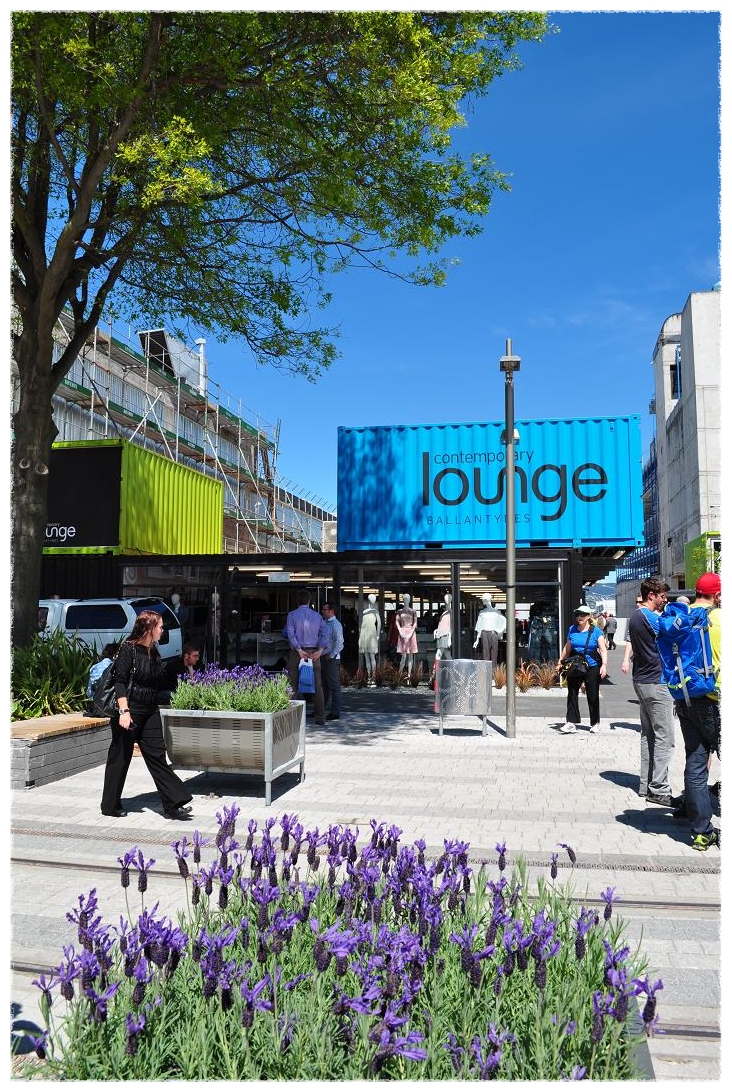지진의 흔적없이 깨끗이 정리된 거리에 새로이 설치된 컨테이너 상점들은