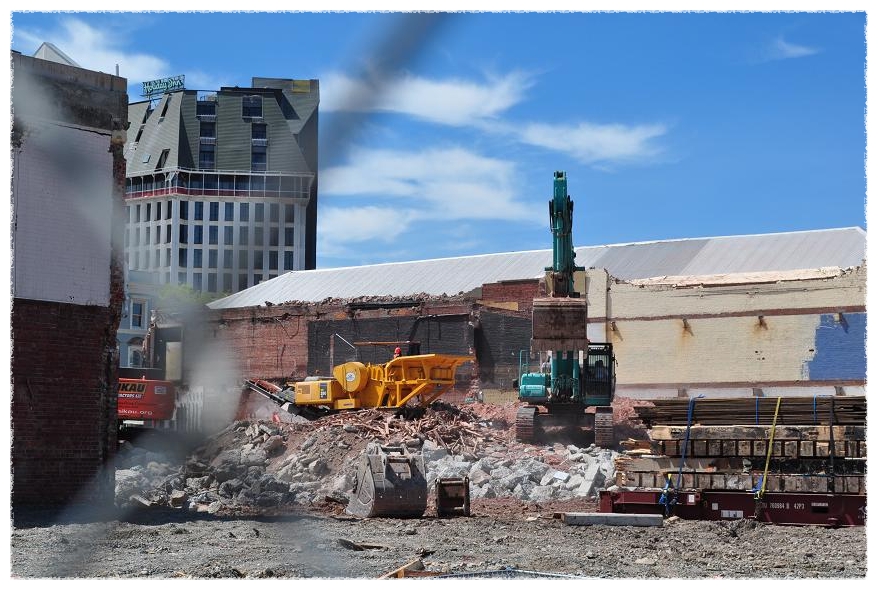 철거작업을 기다리고 있는 중인데 주변 다른 건물들이 먼저 해체되고 있는 중이다.