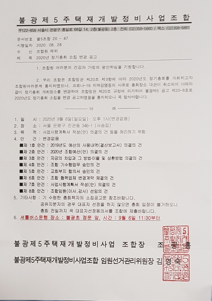 2020년 09월06일 정기총회 유첨된 공고와 같이 [장소]가 [변경]되었습니다.