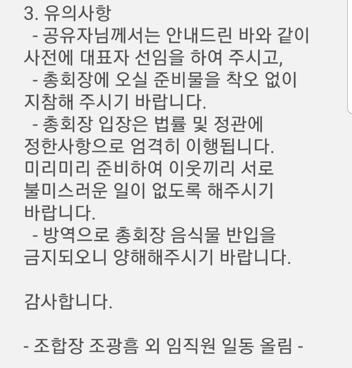 ◇불광5구역조합의 2020년 9월6일 정기총회 참석 안내문! 작성자불광제5재개발성공|작성시간20.09.05|조회수537 목록 댓글 1 글자크기 작게가 글자크기 크게가 ◇불광5구역조합에서 조합원님들께문자로 보낸,2020년 9월6일 정기총회 참석을 위한 안내문 입니다!***** ***** ********** ***** ***** 다음검색 현재 게시글 추가 기능 열기 북마크 공유하기 신고 센터로 신고 댓글 댓글 1 댓글쓰기 답글쓰기 댓글 리스트 작성자불광제5재개발성공 작성자 본인 여부 작성자 | 작성시간 20.09.05 ◇[불광5구역재개발소식통]의 다음 [카페]에서 더 많은 내역을 보기...! http://cafe.daum.net/bulkwang5jaegaebal*위의 링크를 클릭하세요! 댓글 전체보기