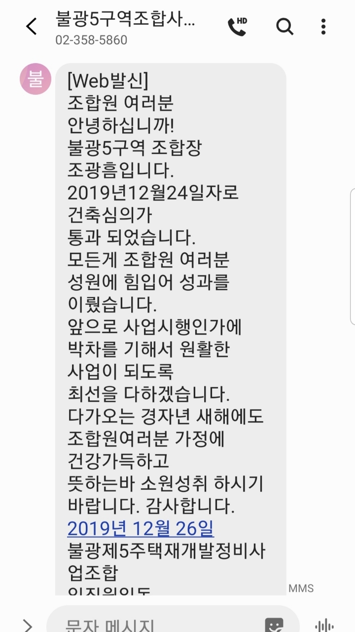 ◇2019년12월24일자로 건축심의가 (원안으로) 통과되었다는 불광5구역 조합의 [Web발신] 공지 내용 보기!