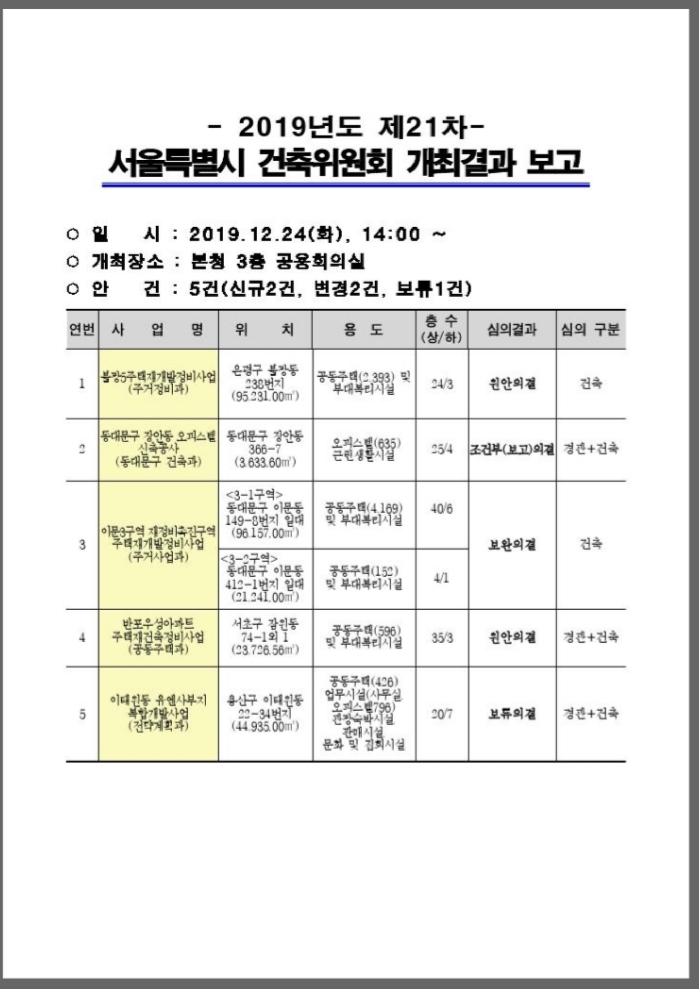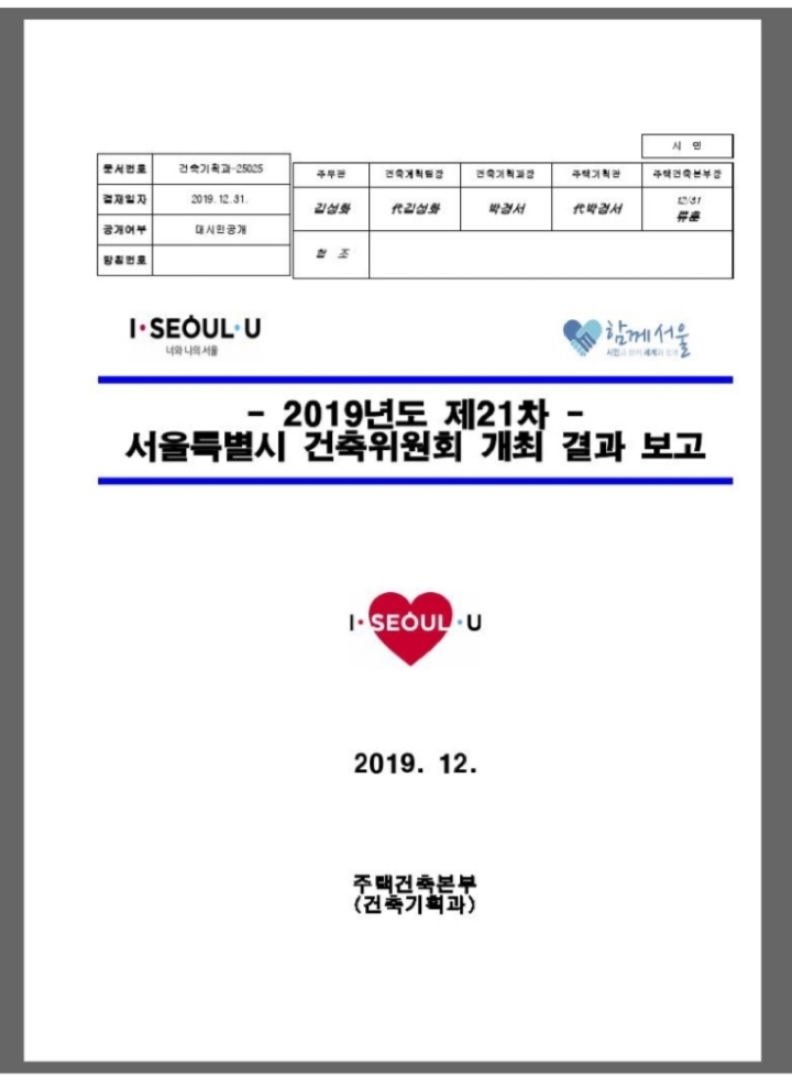 2019년 12월24일 제21차 서울시 건축위원회 개최결과 보고서가 진본임을 확인함! (심의결과는 '원안의결' 및 '건축'으로 통과!)