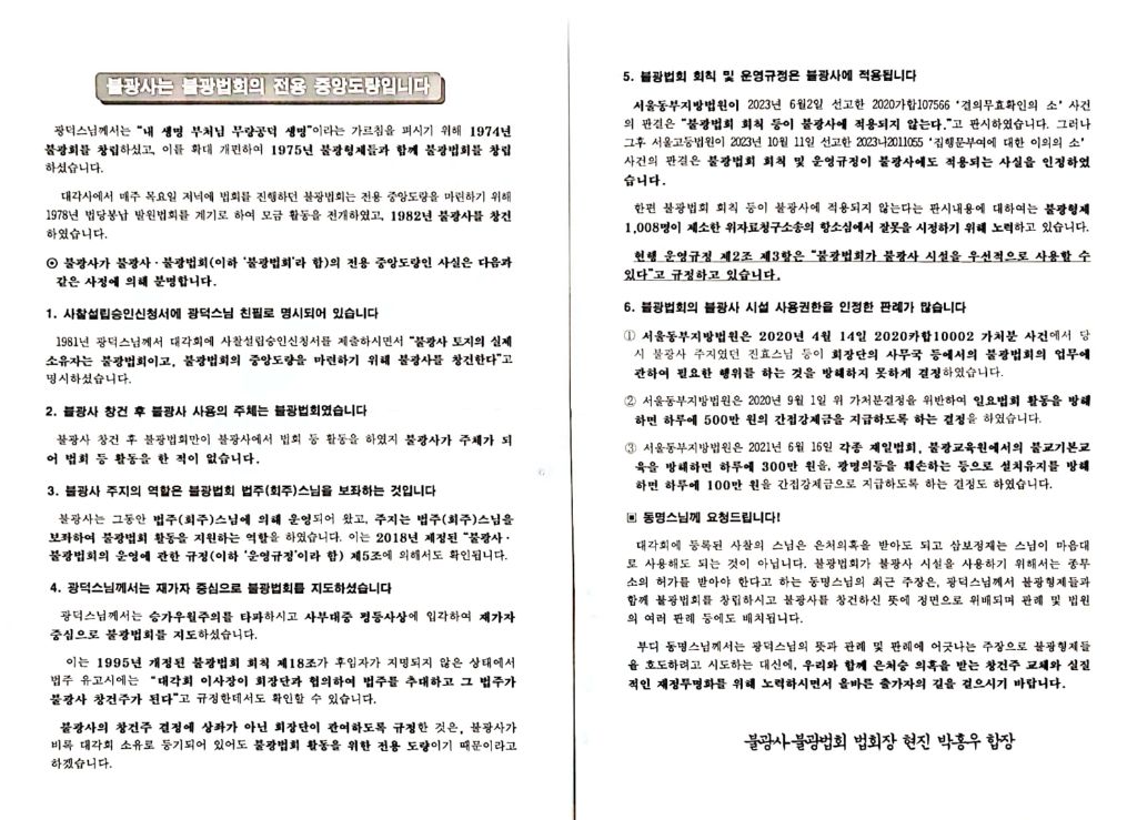 - 이상에서 인정되는 여러 사정들을 종합하면, 불광사는 불광법회의 전용 중앙도량인 사실을 확인할 수 있습니다. 따라서 불광법회의 비품을 반출하라고 하는 동명스님의 주장은 광덕스님께서 불광형제들과 함께 불광법회를 창립하시고 불광사를 창건하신 뜻에 정면으로 위배될 뿐만 아니라 그 동안의 관례 및 법원의 여러 판례 등에도 배치됩니다. 이에 동명스님의 최근 공문에 대하여 깊은 유감을 표하지 않을 수 없습니다. 향후 불광법회 활동을 방해하면 그에 대한 모든 책임은 동명스님에게 있음을 밝혀둡니다.