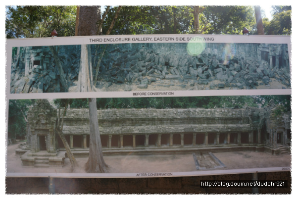 <타프롬의 동쪽 벽면의 복원 전과 복원 후의 사진이 전시되어 있다>
