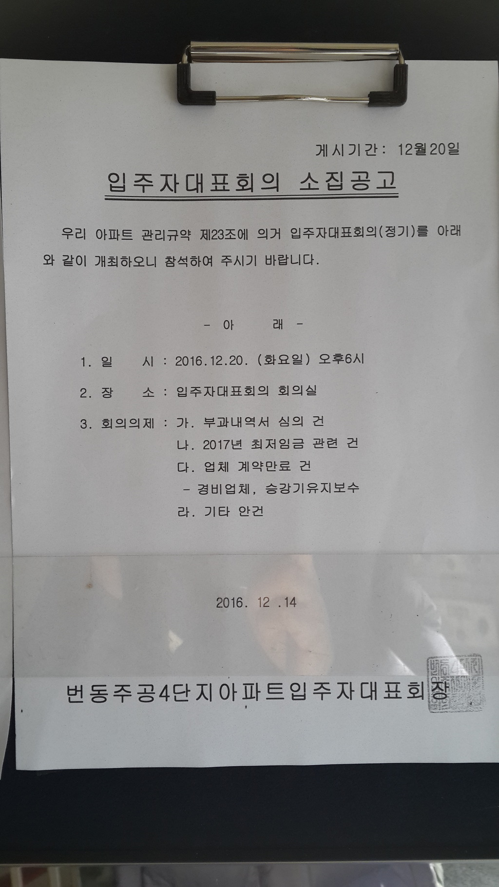 12월 입주자대표회의소집 작성자고 기주|작성시간16.12.18|조회수29 목록 댓글 1 글자크기 작게가 글자크기 크게가 12월 입주자 대표회의소집 다음검색 현재 게시글 추가 기능 열기 북마크 공유하기 신고 센터로 신고 댓글 댓글 1 댓글쓰기 답글쓰기 댓글 리스트 작성자고 기주 작성자 본인 여부 작성자 | 작성시간 16.12.19 회의 방청을 원하시는 입주민께서는 회의 하루전까지 관리사무소에가셔서 방청을 신청하시면 됩니다.~~ 댓글 전체보기