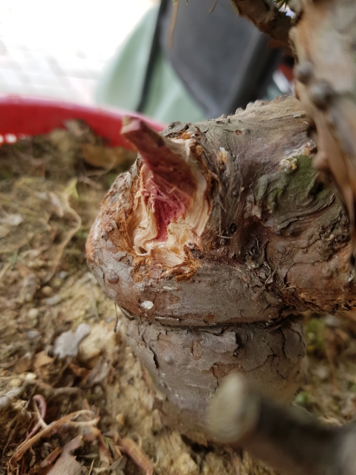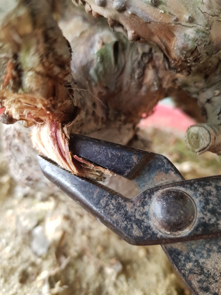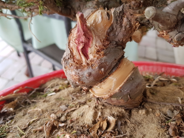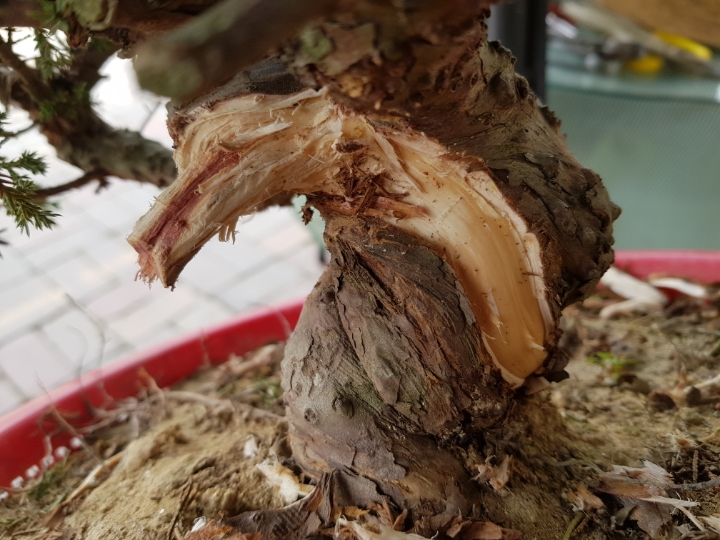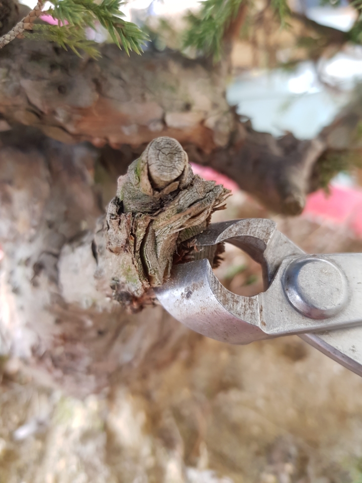 우선 죽은 가지 껍질을 벗기고, 속심까지 찢어내기를 반복하여 모양을 만든다. 그 후 그 주변에서 나무의 물선을 따라 조금씩 아래와 위쪽으로 껍질을 벗기며 진행한다,