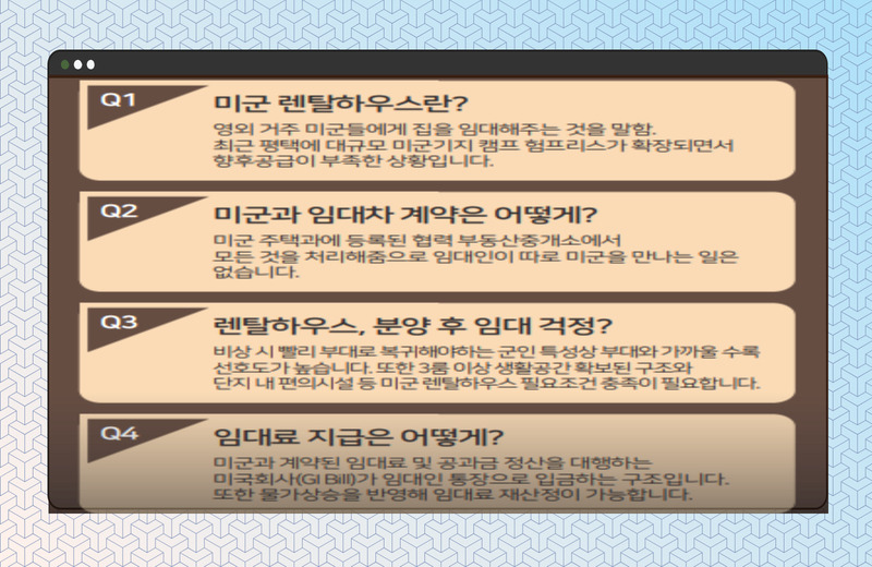 미군 렌탈하우스로 운영될 경우 임대료는 미군 주택과와 계약된 미국 대행업체(GIBill)가 임대인의 계좌로 직접 송금하는 구조로, 임대료 체납 위험이 사실상 없습니다. 안정적인 임대 수익이 가능한 구조는 장기 보유 시에도 꾸준한 현금 흐름을 기대할 수 있는 요소로 평가됩니다.