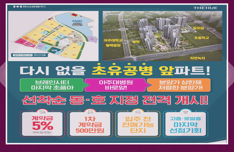 지금 평택 부동산 시장에서 가장 주목받고 있는 지역을 꼽으라면 단연 '브레인시티'를 빼놓을 수 없습니다. 이 도심 속 미래자족도시의 중심에서 단연 돋보이는 존재가 바로 평택 브레인시티 한신더휴입니다. 첨단 산업과 교육, 의료, 주거가 유기적으로 어우러진 입지에 더해, 1군 건설사 한신공영의 기술력과 브랜드 가치까지 더해진 이 단지는 실거주와 투자, 두 마리 토끼를 잡으려는 이들에게 새로운 기회를 제시하고 있습니다.