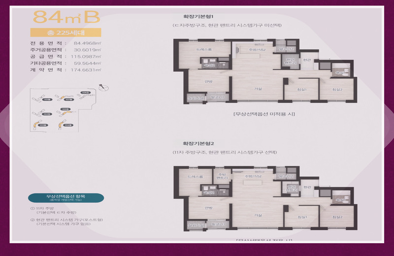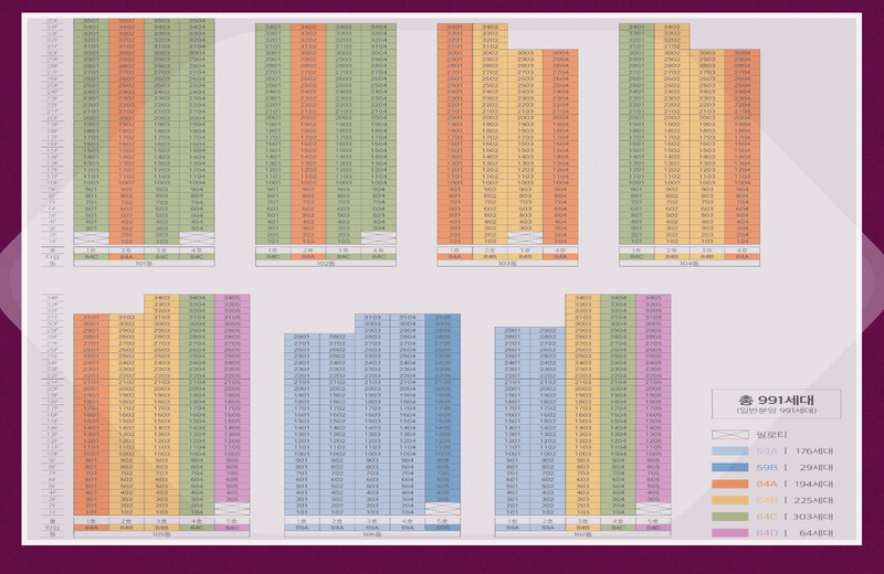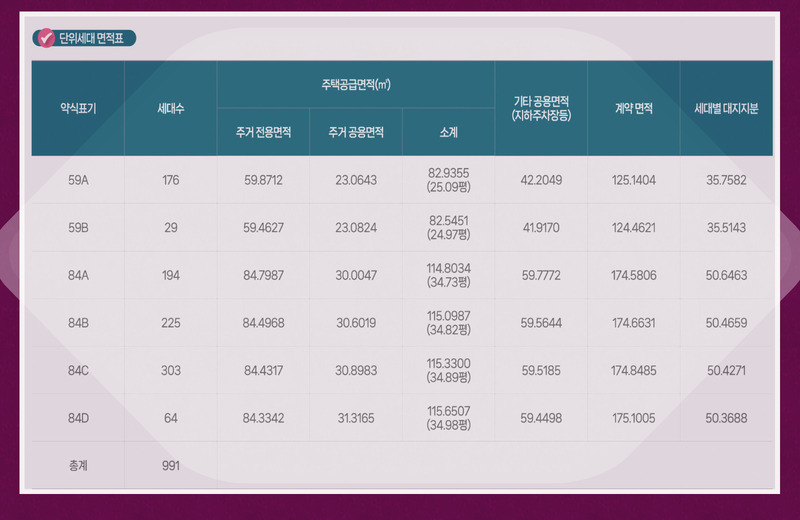 전용면적은 59㎡, 84㎡로 구성되며, 총 991세대가 공급됩니다. 실수요자들이 가장 선호하는 중소형 면적으로, 공간 효율성과 실용성을 고루 갖췄습니다. 59A, 59B, 84A~84D까지 다양한 평면이 구성되어 있으며, 수납 특화 공간과 유연한 구조 변경이 가능한 설계가 특징입니다.