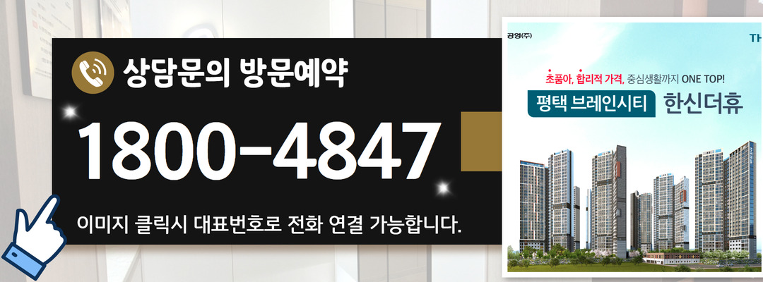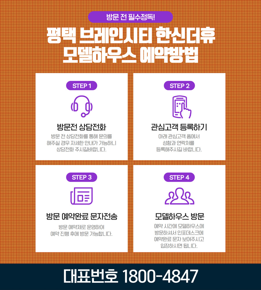 평택 브레인시티 한신더휴 모델하우스는 평택시 죽백동 일원에 위치해 있으며, 현재 사전예약제로 운영 중입니다. 단지 전반에 대한 상세한 안내와 함께 평면도, 커뮤니티, 마감재 등을 직접 확인해 보실 수 있고,아래 대표번호를 통해 방문 예약 가능합니다.