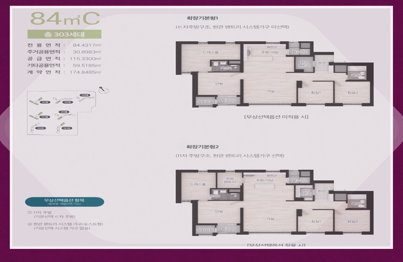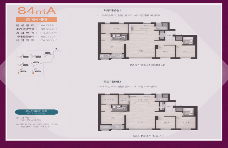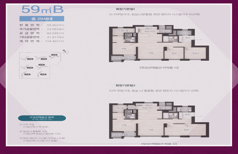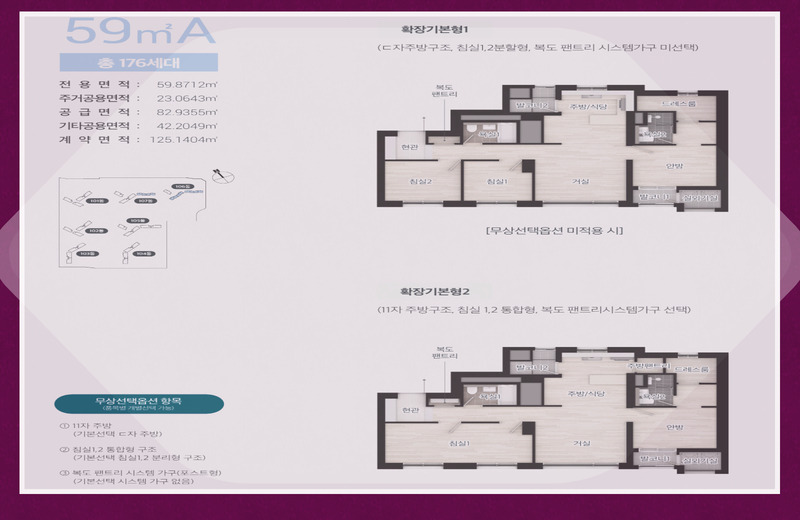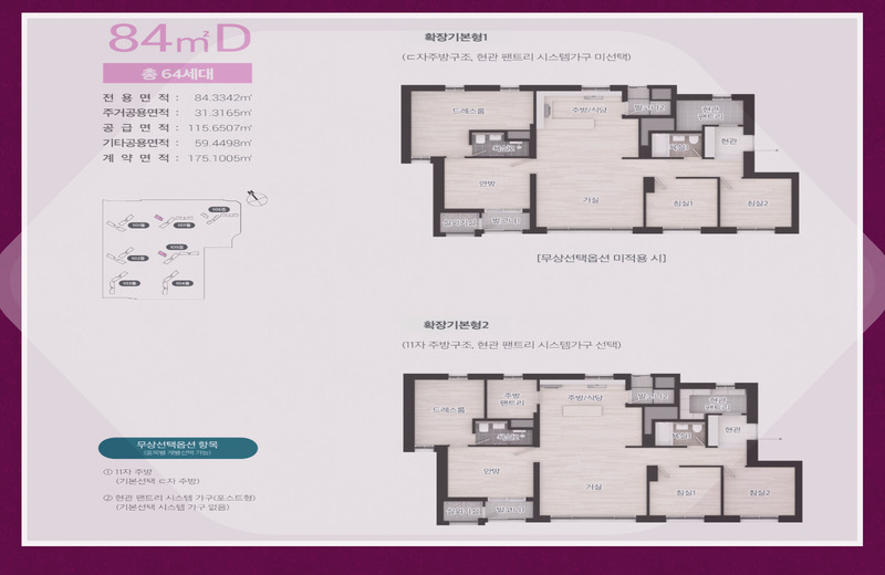 평택 브레인시티 한신더휴 아파트 59㎡는 A형과 B형으로 나뉘며, 실속형 공간 구성에 복도 및 현관 팬트리를 더해 수납을 강화했습니다. 84㎡는 A~D형까지 4가지 타입으로, 4Bay 맞통풍 구조, 광폭 드레스룸, ㄷ자 주방, 현관 팬트리 등 생활에 최적화된 설계가 돋보입니다. 무상 선택옵션으로 주방 형태 및 팬트리 구성을 유연하게 조정할 수 있습니다.