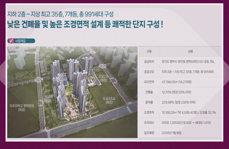 평택 브레인시티 한신더휴 아파트는 총 7개 동, 지하 2층~지상 35층 규모로 설계된 대단지입니다. 건폐율은 12.7%로 매우 낮아 단지의 쾌적성이 우수하며, 조경면적은 약 15,168㎡로 조경률은 32.1%에 이릅니다. 주차대수는 총 1,395대로 세대당 약 1.41대가 확보돼 있어 여유 있는 주차환경을 제공합니다. 입주는 2028년 1월 예정입니다.