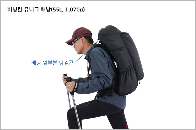 2) 경사가 심한 오르막에서 상체를 구부린 만큼 멜빵길이 조절끈과 배낭 윗부분 당김끈 조절을 잘 하기 때문에 오르막도 잘 올라갈 수 있습니다.