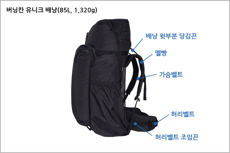 특히, 85L 유니크 배낭은 이전보다 티타늄프레임 하단부의 아치형 각도와 높이가 더 커지고, 100L급 배낭처럼 허리벨트를 두툼하게 만들어 배낭 무게를 더 잘 지지해주고 허리도 더욱 편안합니다.