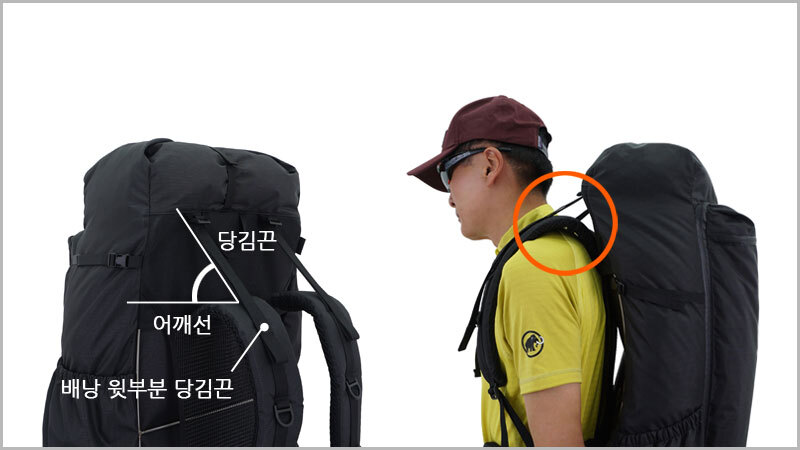 배낭의 무게중심이 어깨 쪽에 있도록 배낭 윗부분 당김끈을 몸 쪽으로 당기는 것이 무게중심을 잡는데 중요한 역할을 합니다. 이때, 어깨선과 당김끈 사이의 각도가 크면 클수록 더 확실한 기능을 발휘하는데 만약 당김끈의 높이가 어깨선보다 아래에 있다면 그것은 멜빵을 바짝 당기지 않았기 때문입니다.
