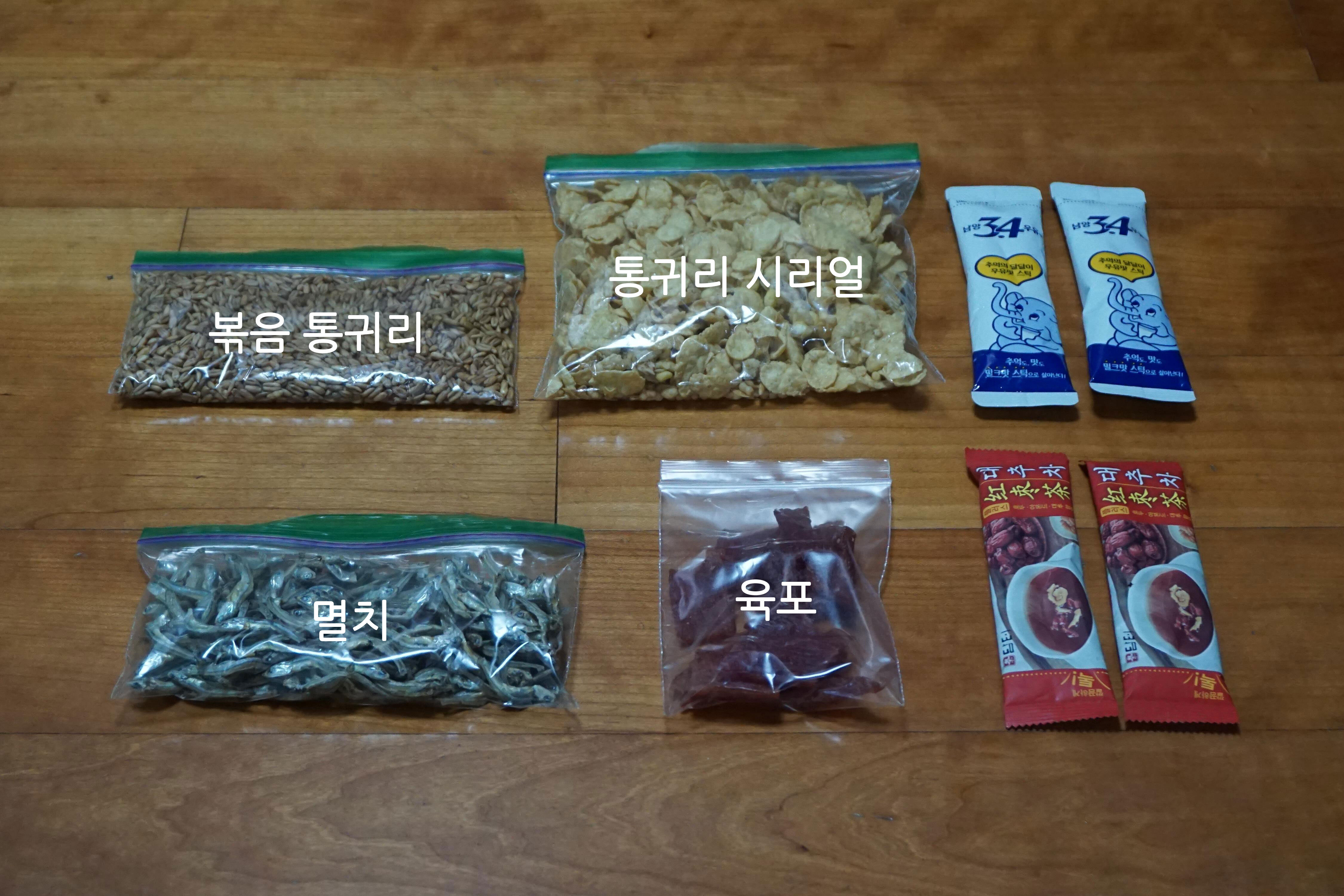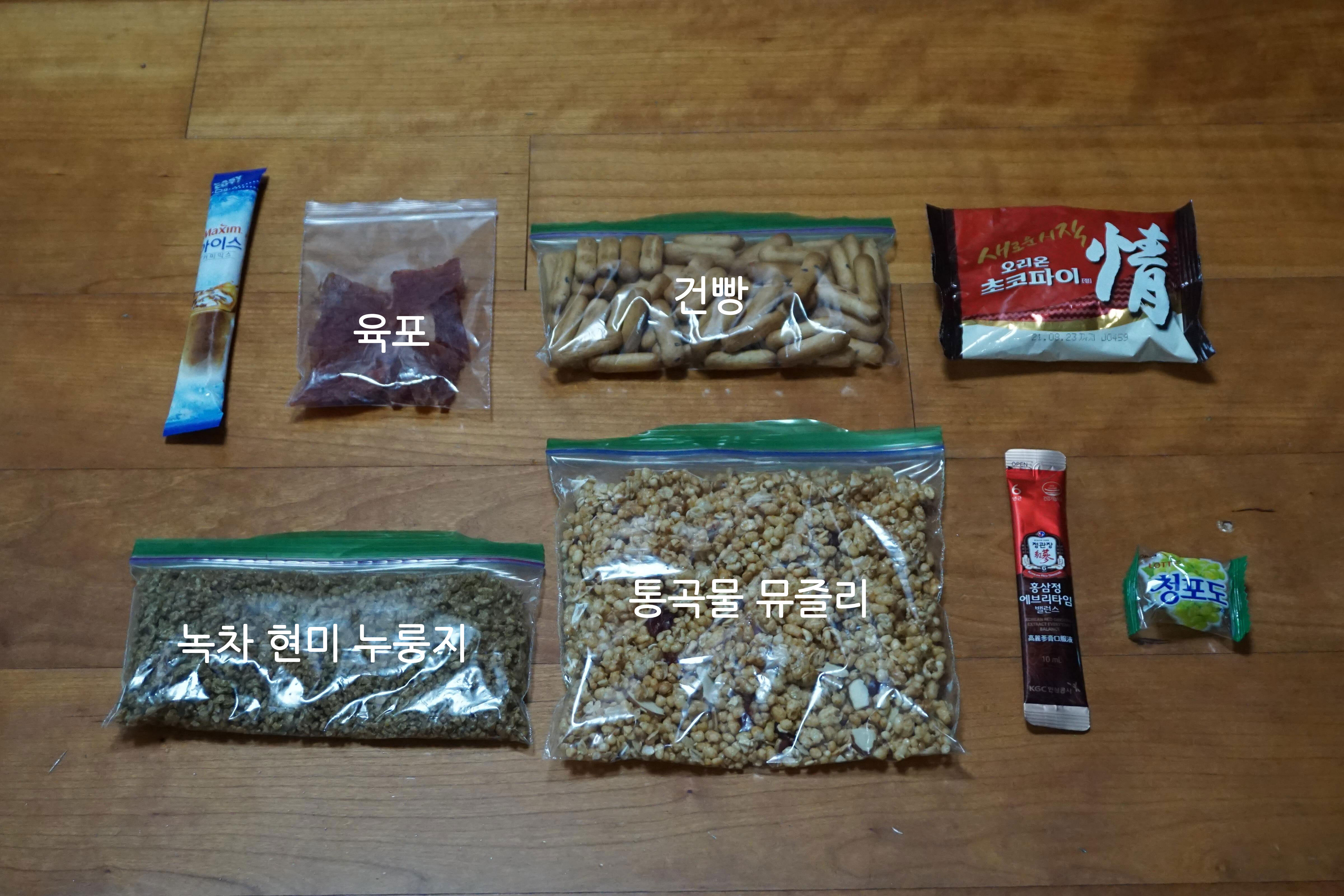중식으로 녹차 현미 누룽지와 통곡물 뮤즐리를 먹고 행동식은 쉴 때마다 조금씩 나누어 먹고, 그날 가장 힘들다는 생각이 들 때 사탕을 먹습니다.