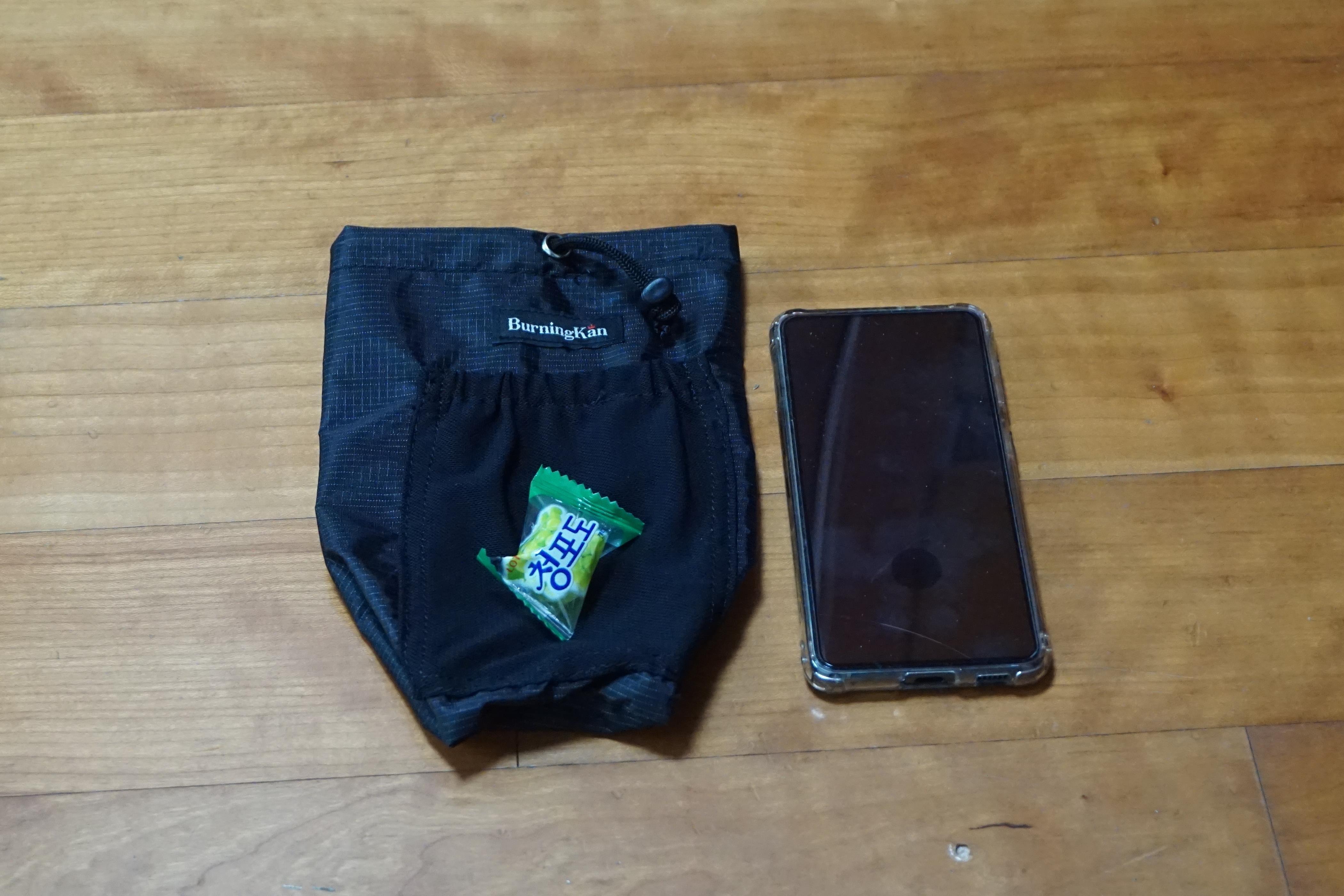 백패킹시 가장 많이 사용하는 카메라를 보관하기 위해 배낭 멜빵에 메고 다녔는데 이번에는 카메라를 가져가지 않기 때문에 스마트폰을 넣고 전면 포켓에는 사탕을 넣습니다.