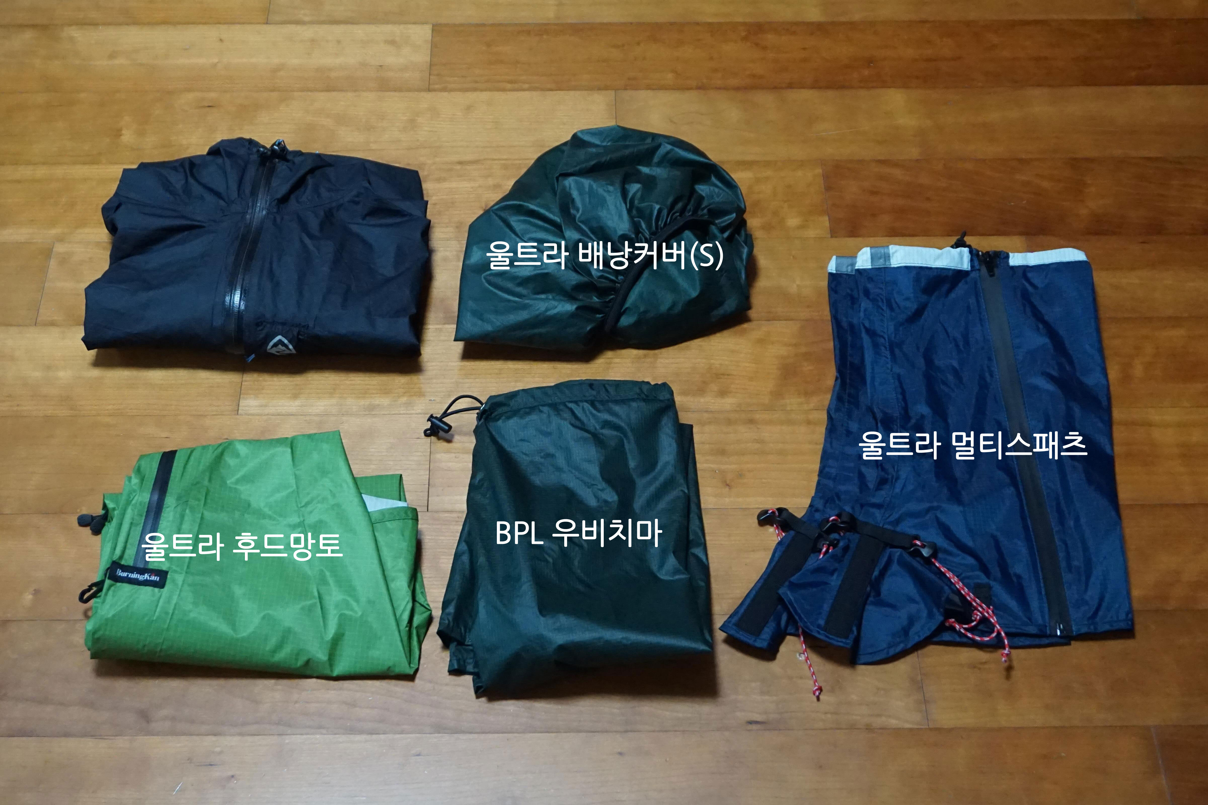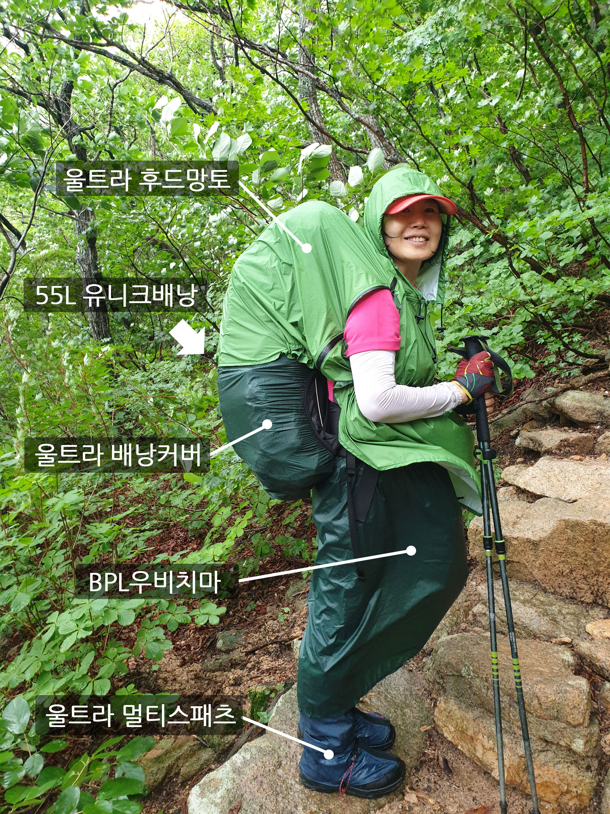 43. 울트라 후드망토(140g) – 활용도가 많고 방수/투습 자켓과 판초기능을 하나로 해결하여 비가 올까 말까~ 추울까 말까~ 무게 때문에 넣었다 뺏다 고민하면서 휴대했던 방수/투습 자켓을 대신한 초경량 기능성 후드 망토로 배낭을 덮어서 사용할 수 있습니다.