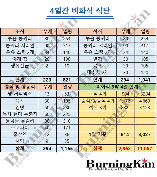 백패킹은 가벼운 무게와 영양분이 골고루 들어간 열량과의 싸움입니다. 그래서 식량은 가벼우면서 각종 영양소가 고르게 들어가고 산행에 필요한 1일 3,000kcal정도의 음식을 균형 있게 먹는다면 배가 고프지도 부르지도 않는 적당한 식사로 건강하고 힘들지 않게 산행을 즐길 수 있다고 생각합니다.
