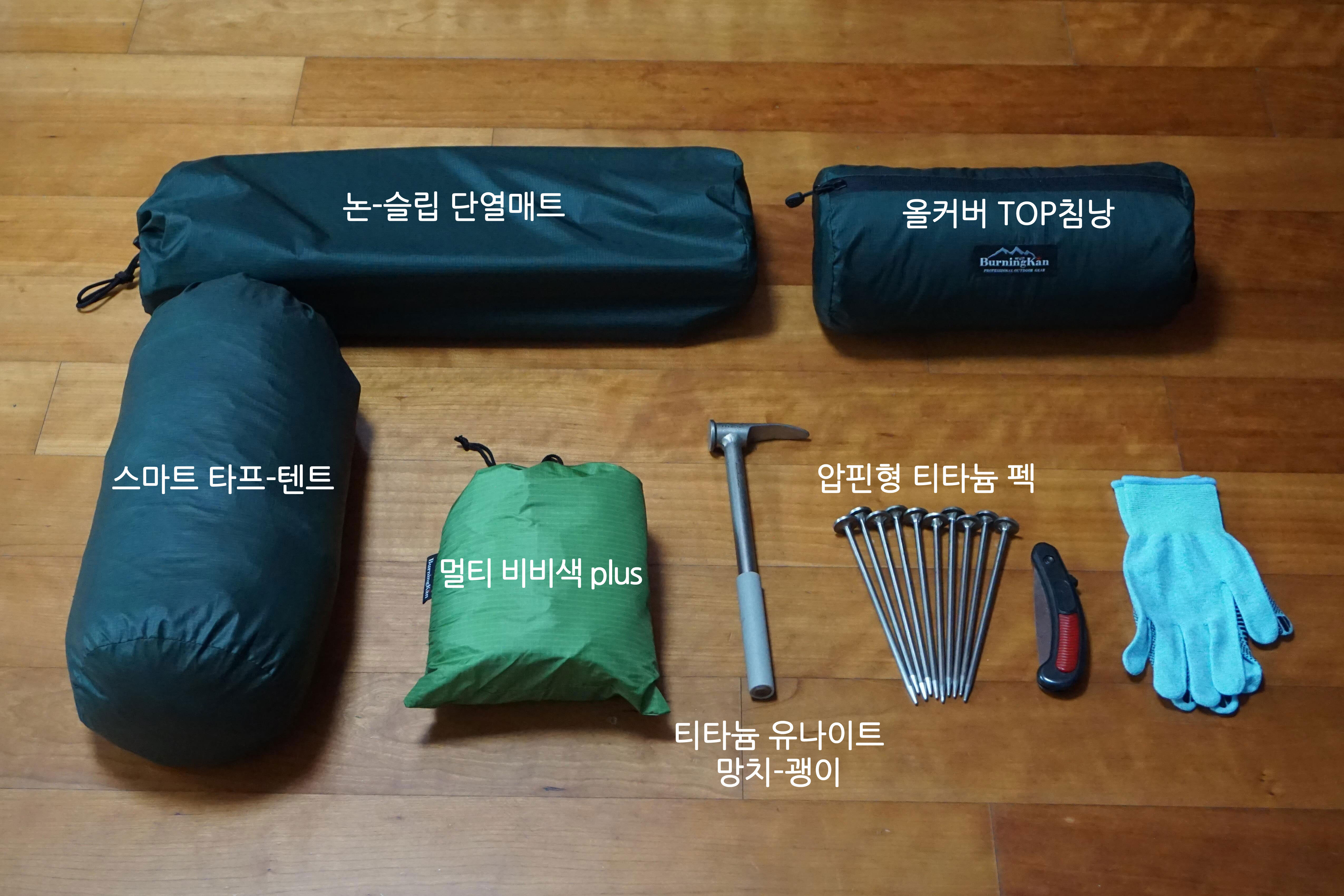 하지만 비박 장비를 하나하나 경량으로 연구개발을 하면서 55L 유니크 배낭이 출시된 이후에는 버닝칸 제품으로 패킹을 한다면 초보자도 누구나 경량(15kg 내외)으로 패킹할 수 있다는 것을 2020년 10월, 8박 9일간 서락속살 동서횡단 종주에서 확인하였습니다.