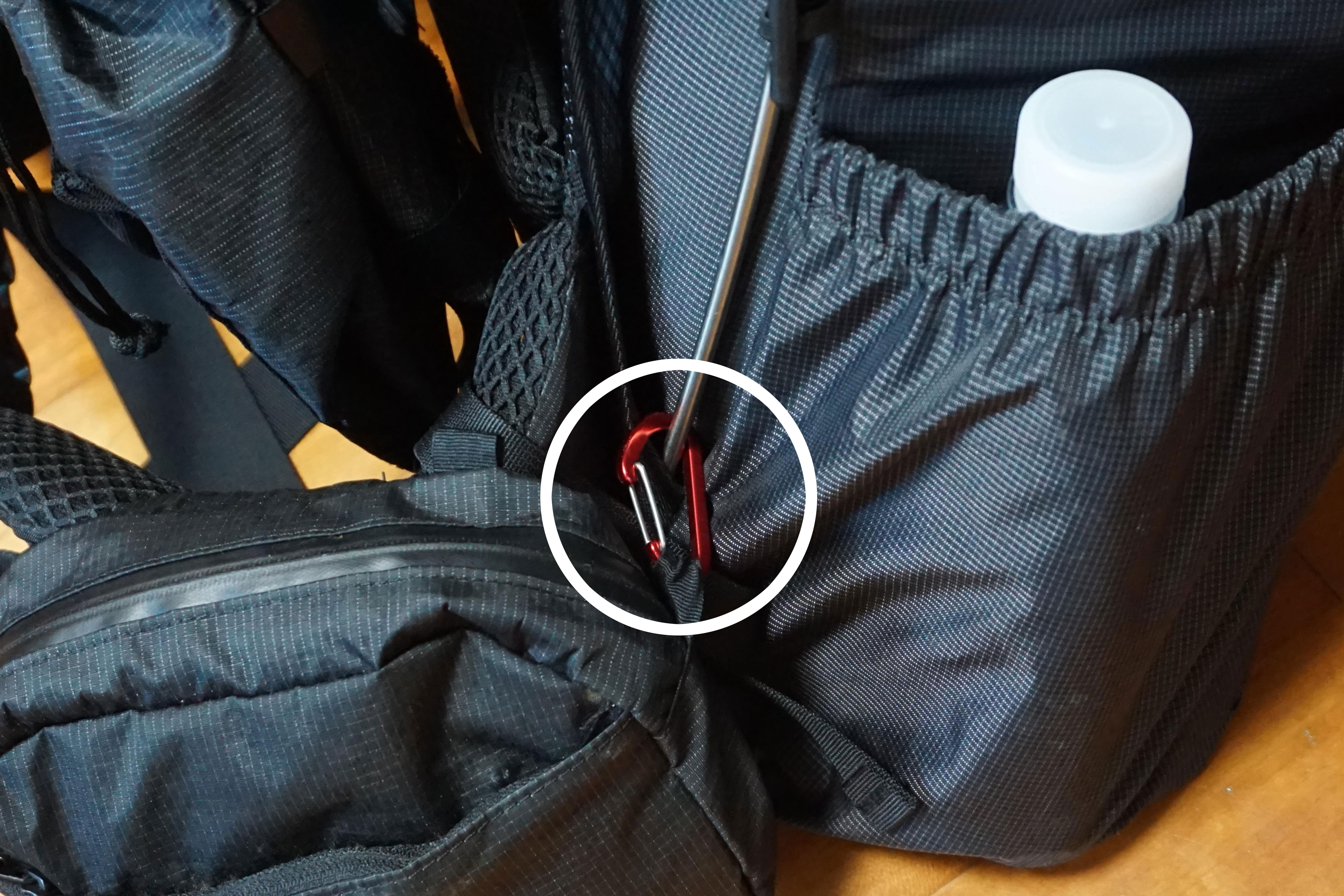 유니크 배낭 허리벨트에 연결할 때는 카라비너를 티타늄 프레임에 끼워서 사용하면 허리 벨트에서 분리되지 않아 좋습니다.