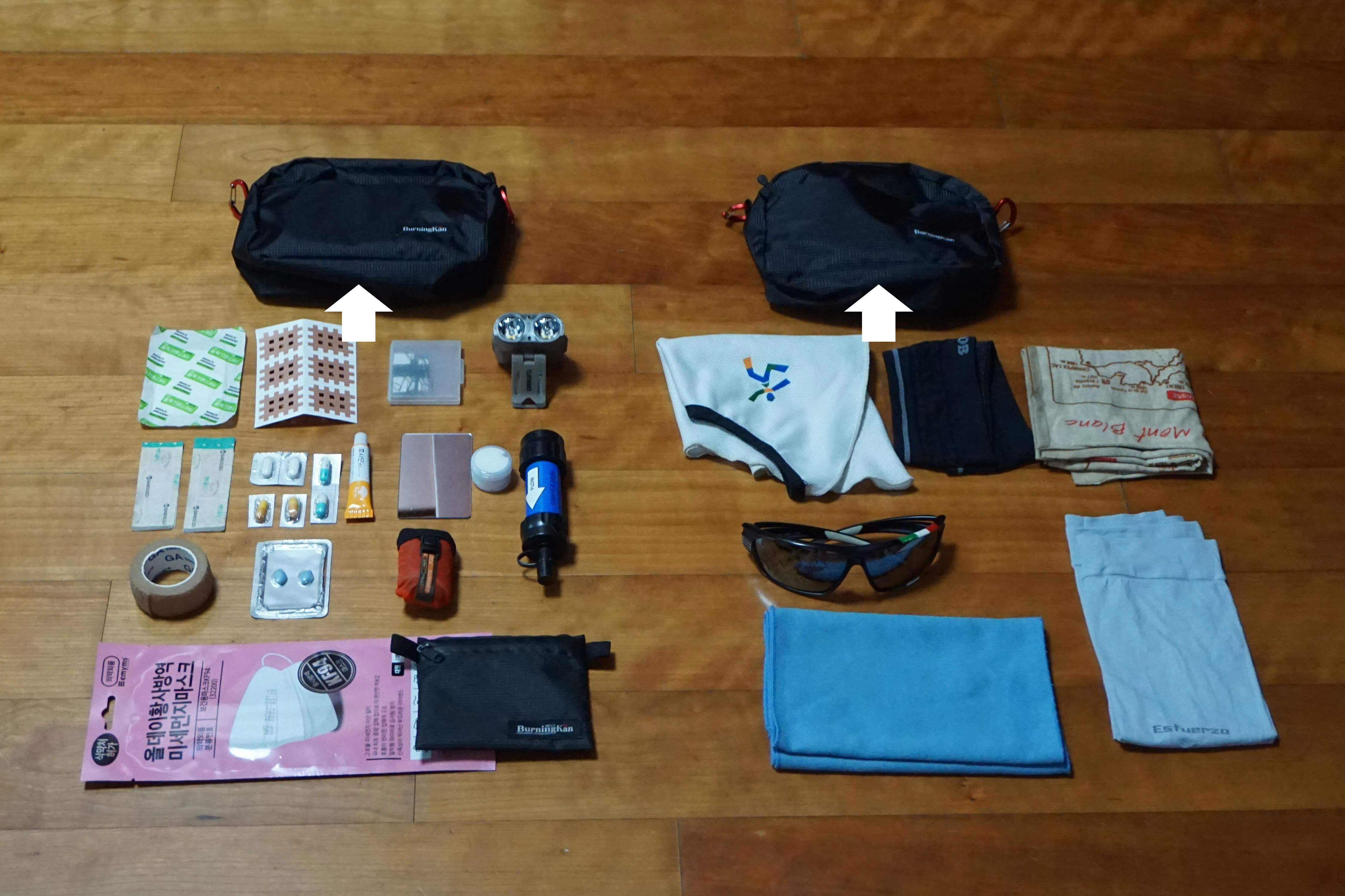 전에는 벨트 파우치를 1개만 하고 다녔는데 어깨 부담을 덜기 위해 앞으로는 양쪽에 2개를 매달아 산행 중에 많이 사용하는 용품을 번거롭지 않도록 본체에 넣지 않고 모두 양쪽 벨트 파우치에 넣어 다니기로 하였습니다.