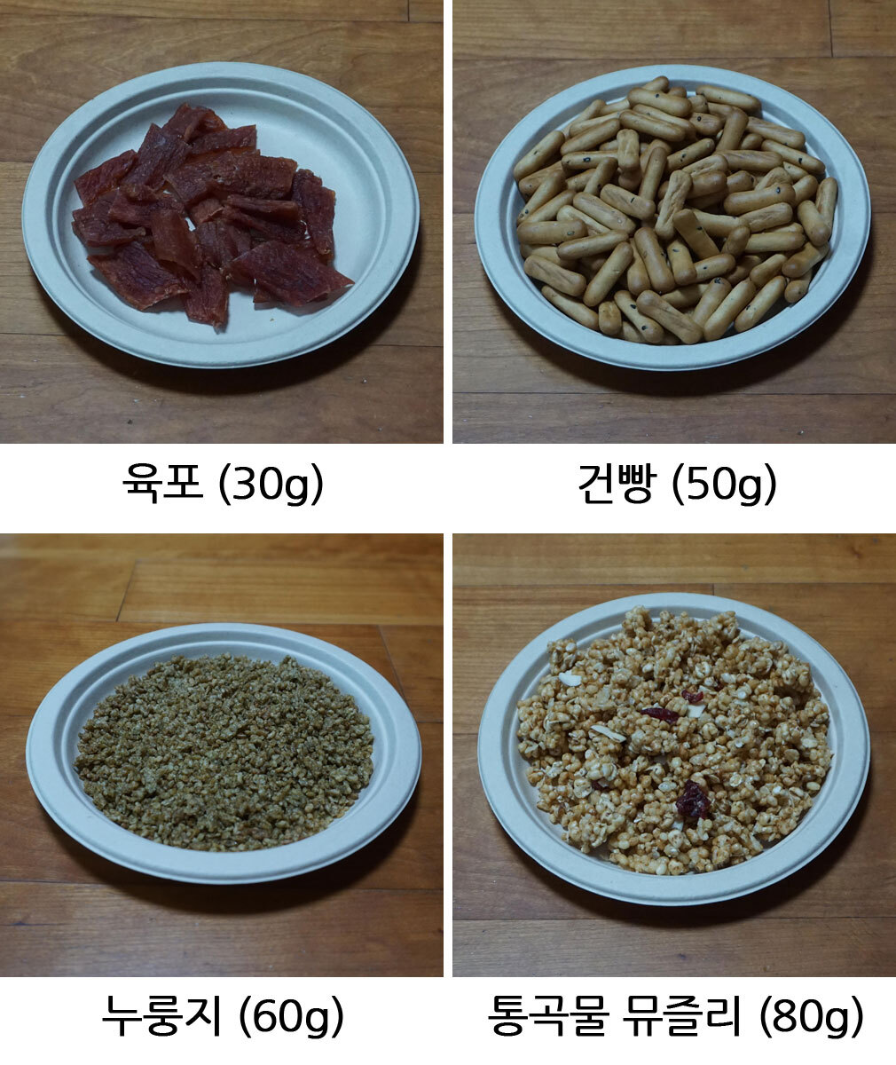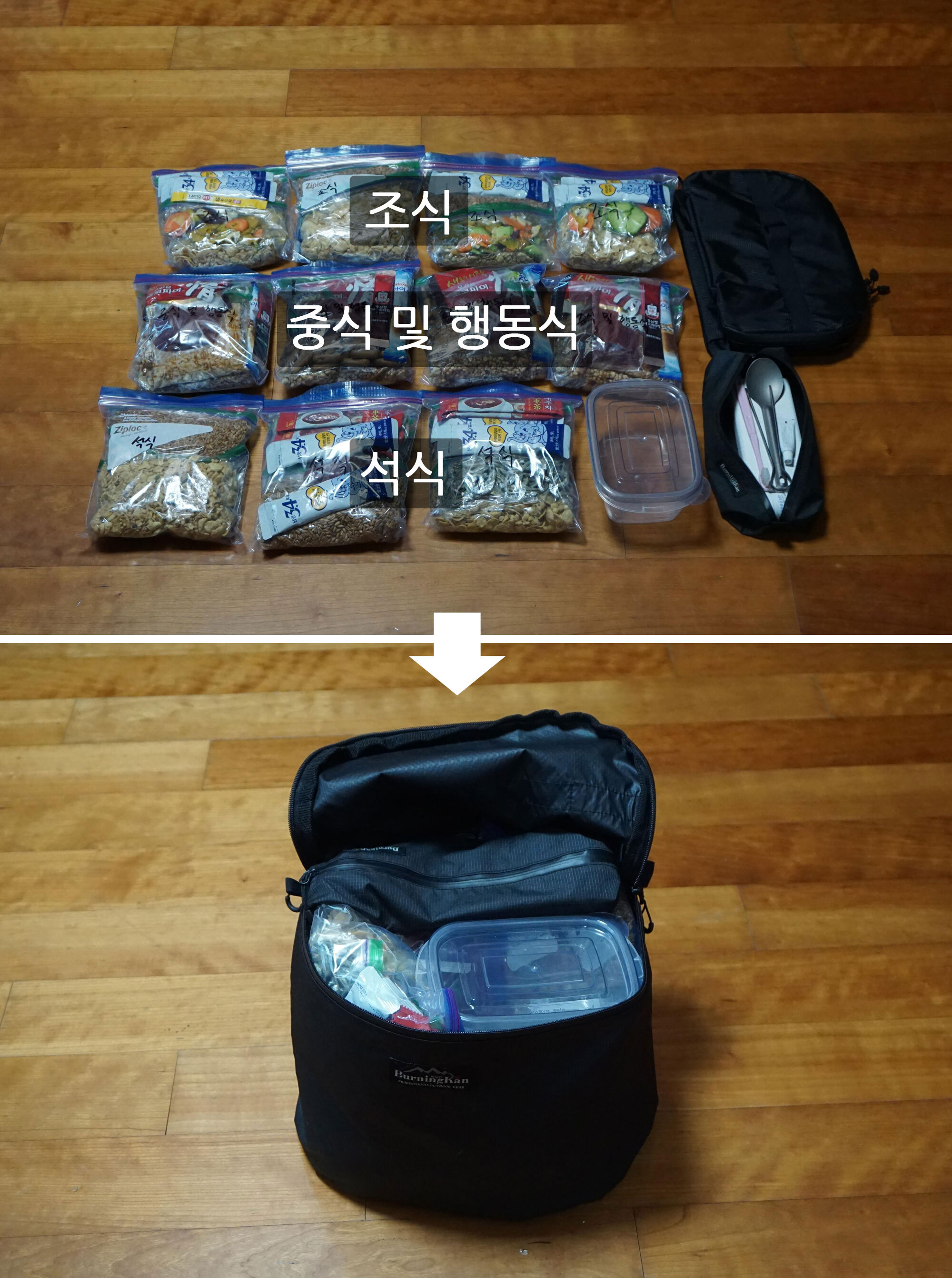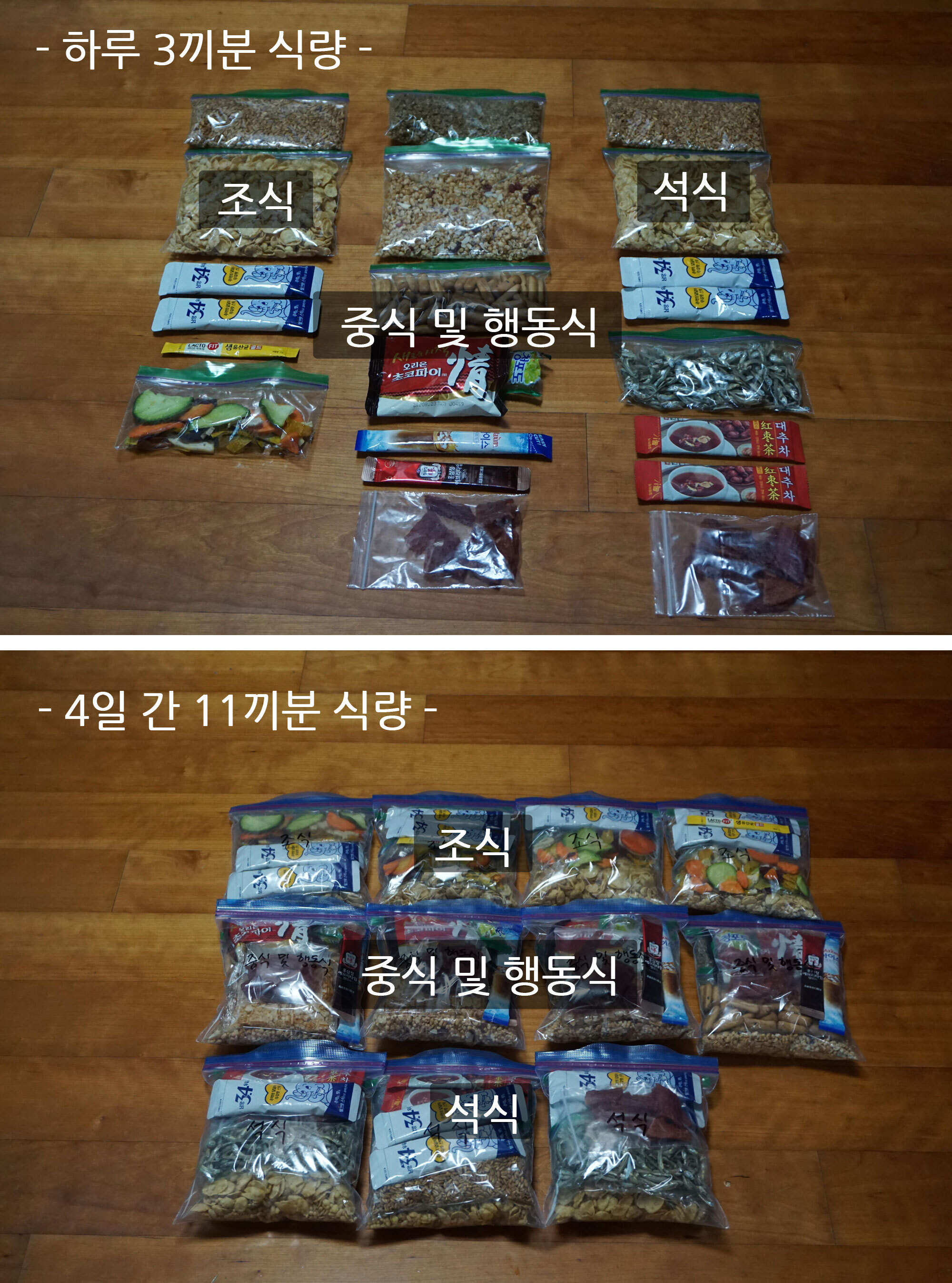사전에 산에서 먹는 것처럼 운동을 하면서 하루치를 먹어보았는데 전혀 배가 고프지 않았고 맛도 좋아 계속 먹고 싶었습니다. 먹는 것은 취향에 따라 다르고 한식이 아니기 때문에 다양하게 먹는 즐거움이 없다고 할 수는 있지만, 저는 장거리 산행에서 이처럼 가볍고 균형 잡힌 식사를 맛있게 먹을 수 있는 것에 만족을 하고 감사하게 생각합니다.