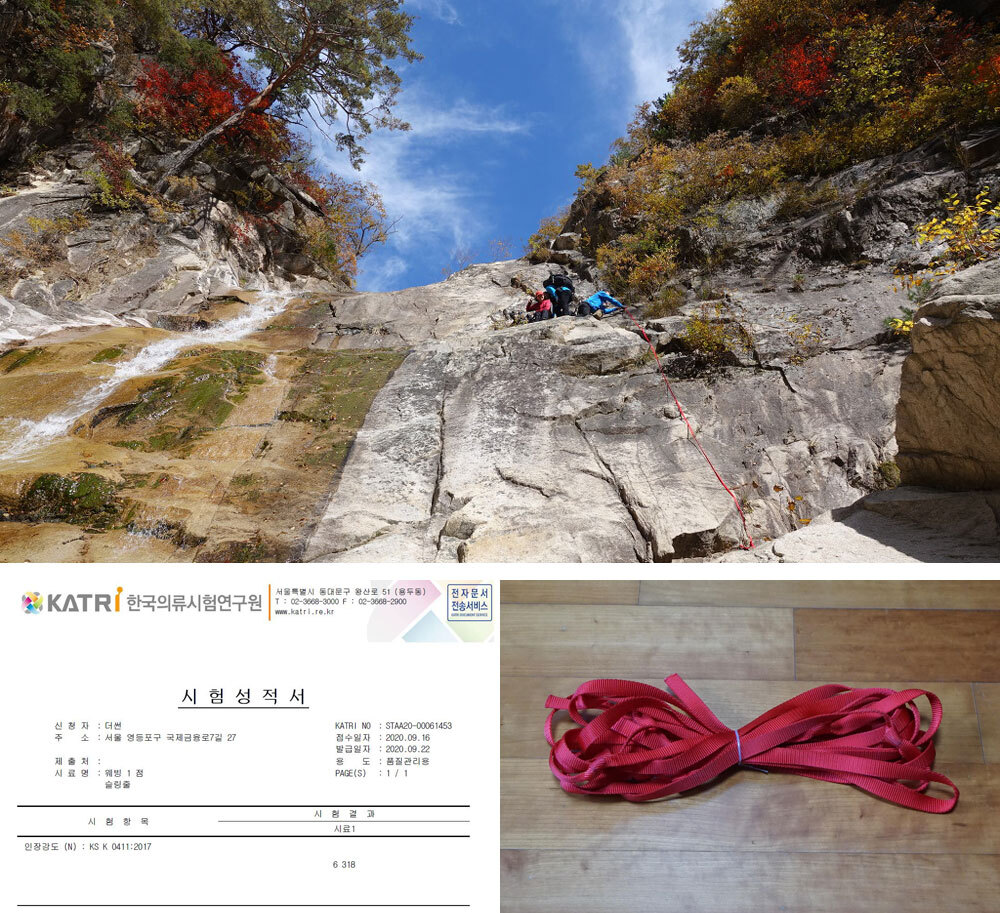 5. 테이프 슬링(길이 10m, 폭 15mm, 222g) – 튜브타입 테이프 슬링줄 또는 굵은 코드 슬링보다 무게를 줄이기 위해 이리저리 알아보고 안전한지 인장력 시험까지 한 가벼운 웨빙 슬링줄로 작년 8박 9일 서락속살 종주 때 필드테스트까지 완료하여 앞으로도 계속 사용할 예정입니다. 이전에 제가 가지고 다니던 10m 튜브타입 테이프 슬링줄은 324g으로 102g을 줄였습니다.