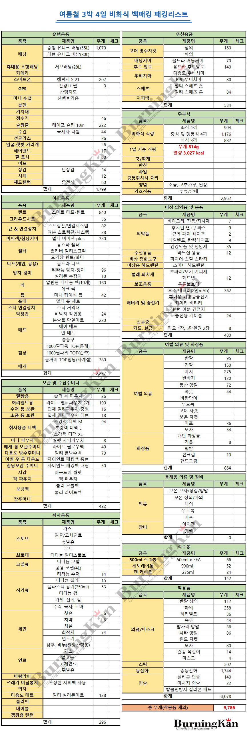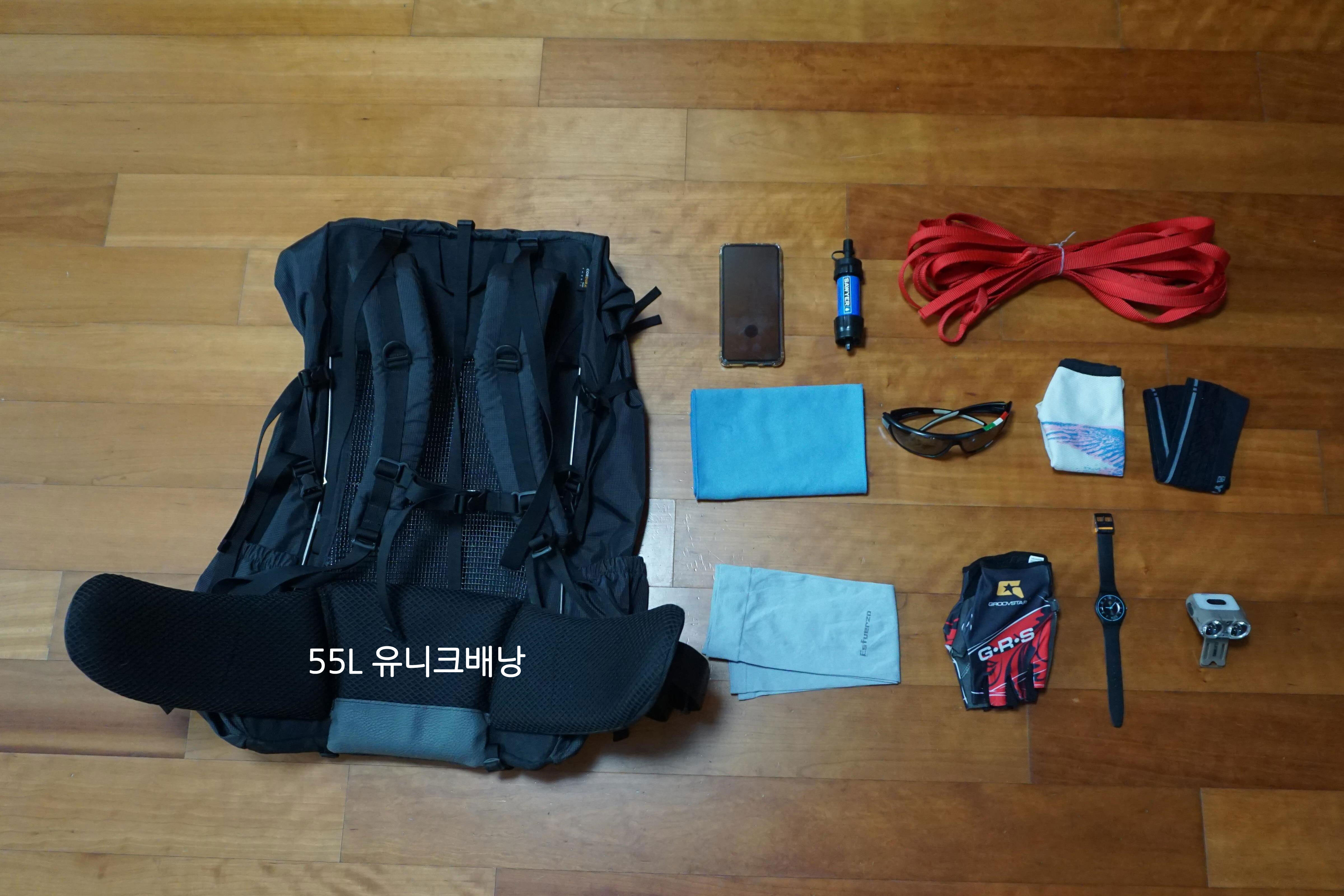 이번에 준비한 패킹리스트는 이전 비화식으로 준비했을 때 보다 암벽장비 슬링줄이 추가되었고 1일 기준 식량 무게가 100g 정도 늘어났지만, 그동안 근교 오지 비박산행에서 필드테스트를 했던 논-슬립 단열매트, 올커버 TOP침낭 등 여러 장비들을 경량으로 교체하고 필요 없는 것은 뺐더니 총 무게가 9.78kg으로 줄어 드디어 저의 꿈이 이루어졌습니다. 그리고 55L 유니크 배낭에 패킹을 해보았는데 전면 포켓에는 아무것도 넣지 않고 본체 티타늄 프레임 상단 아래부분까지 수납되어 용량이 40L 이하로 패킹된 것을 확인하고 너무 좋아서 환호성을 질렀습니다.