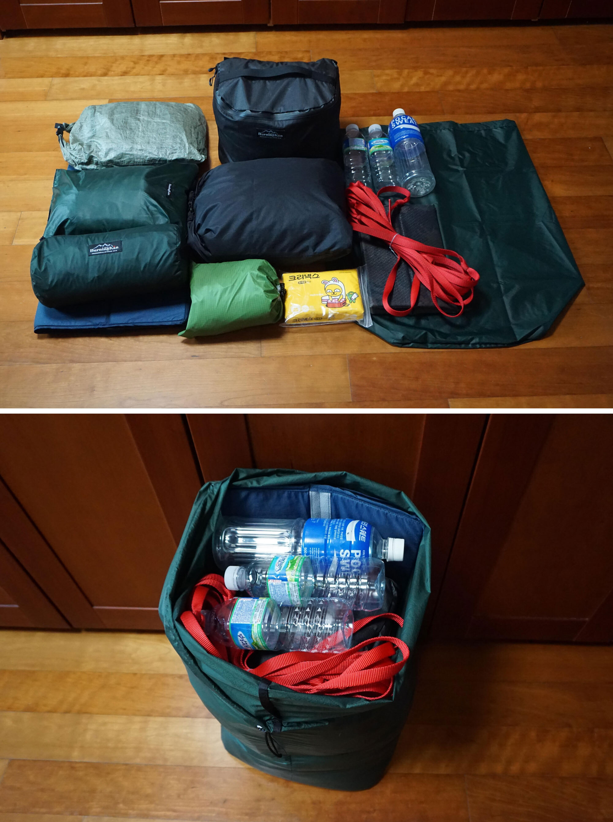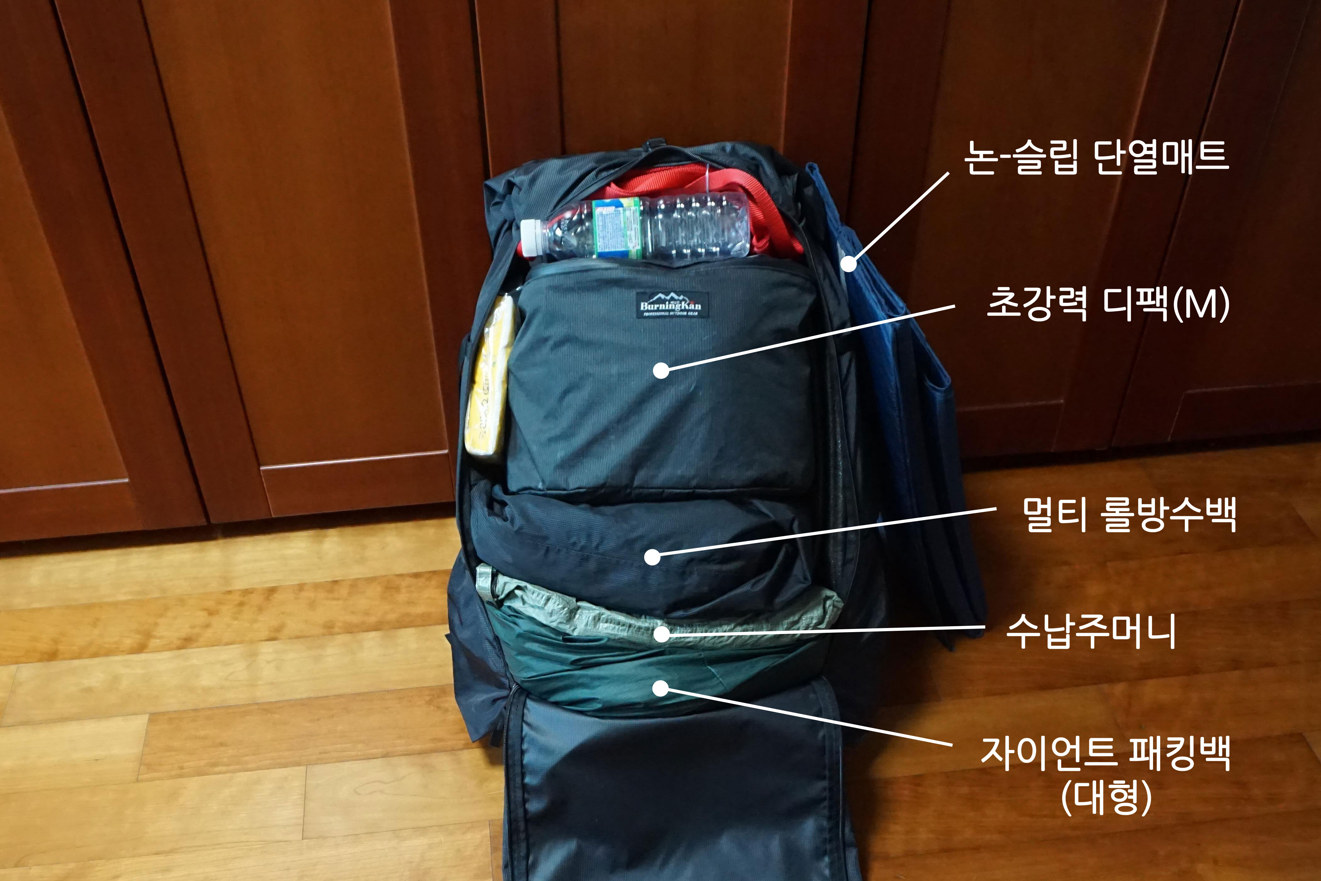 배낭 내부에 가벼운 논-슬립 단열매트를 전면에 세우고 자이언트 패킹백 대형에 올커버 TOP침낭(보관주머니 없이), 라이트 필로우백(여벌 옷), 멀티 비비색을 넣고 수납주머니(우천용품), 멀티 롤방수백(스마트 타프-텐트 등), 초강력 디팩(식량 등)을 차례대로 올려서 패킹합니다.