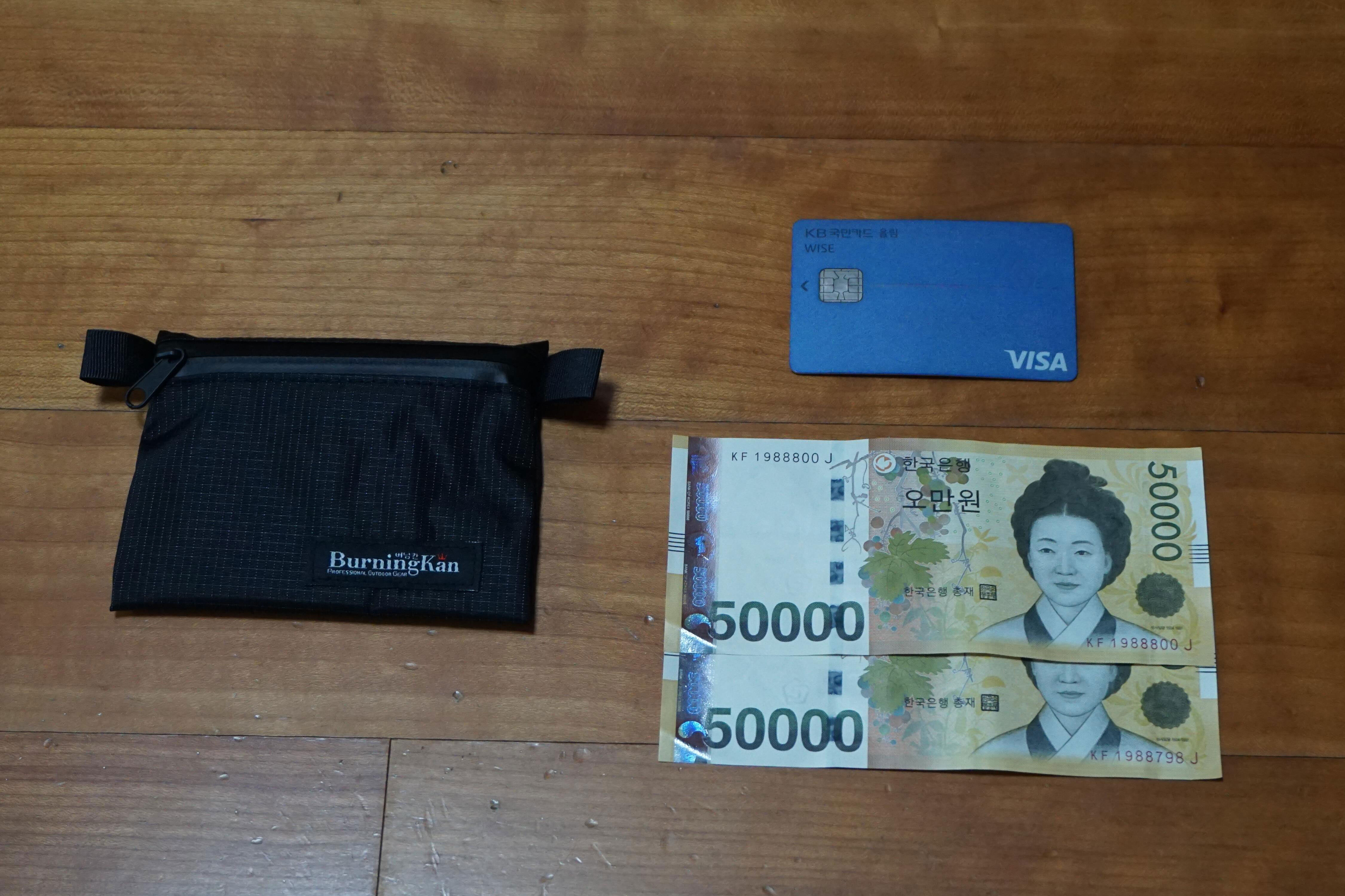 꼭 필요한 신용카드 1장과 지폐 5만원권 2장만 넣어 갑니다. 1g이라도 소중히 여겨야 무게를 줄일 수 있습니다.