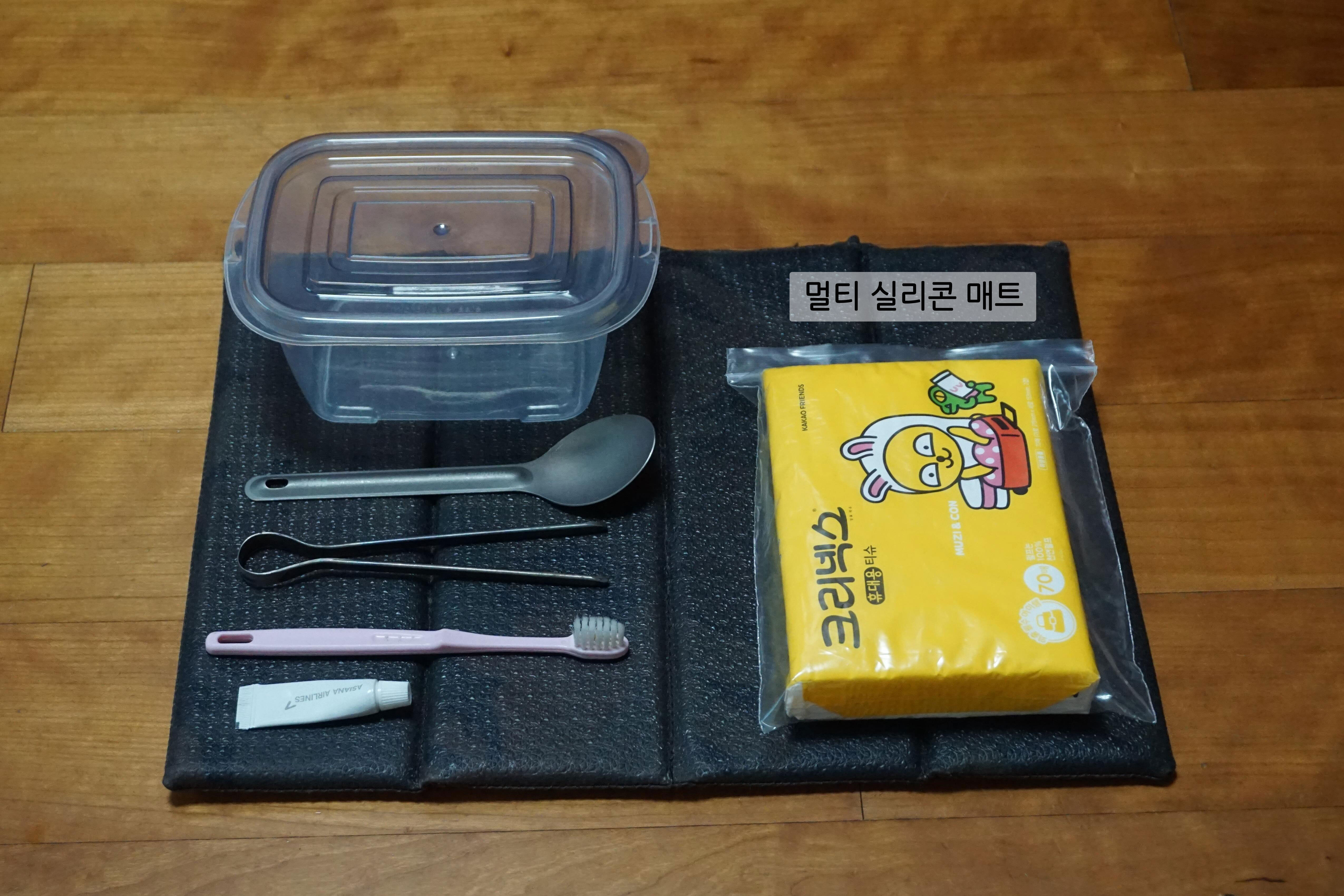 입체 멀티파우치 중형에는 티타늄 수저, 티타늄 집게, 치약/칫솔, 건강약품, 충전용 케이블, 보조 배터리를 넣습니다.