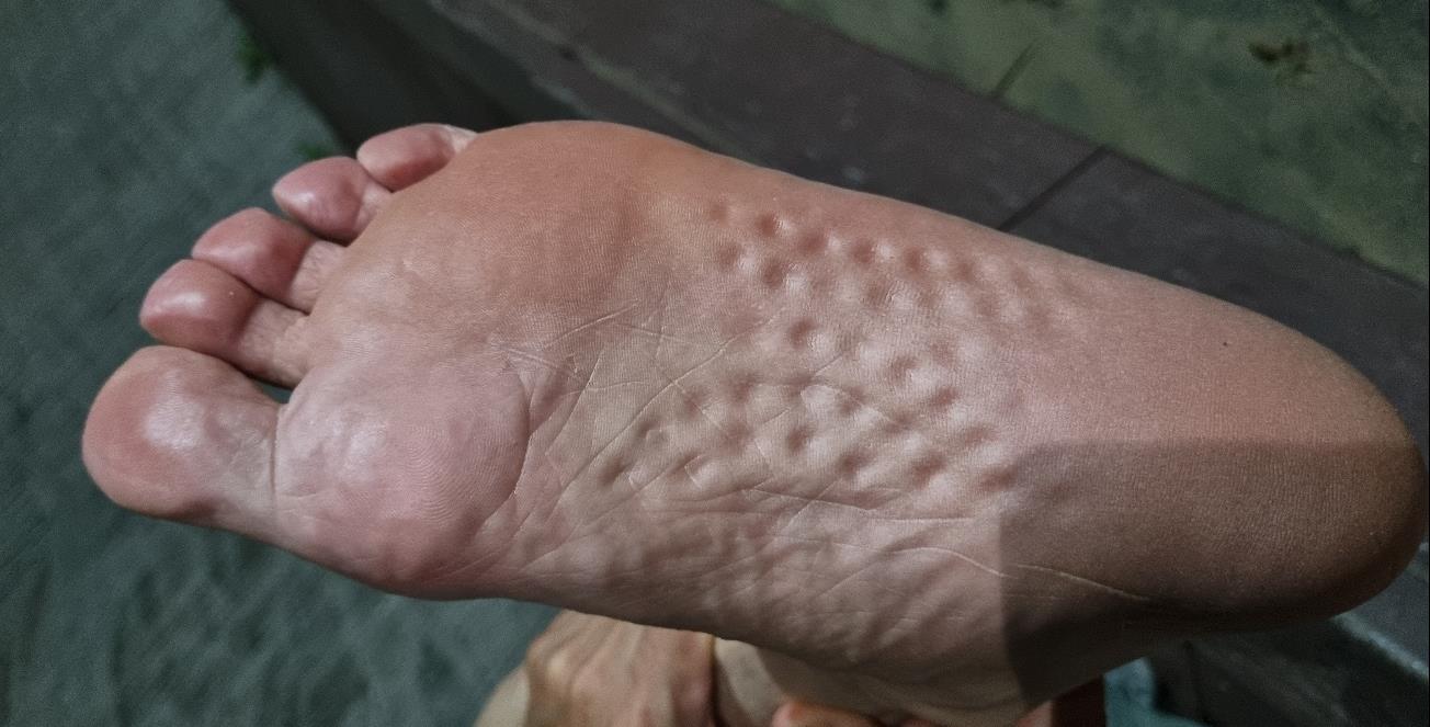 이 말을 들은 친구가 실리콘 원단을 부착한 마사지 인솔(주문제작 특수 내열테이프 사용)을 제작해 주어서 신발에 깔고 1시간가량 걸어 보았는데 그날부터 신기하게도 발바닥에서 열이 나거나 쥐가 나지 않았습니다. 그리고 매일 아침 저녁으로 걷기운동을 하는데 이 마사지 인솔을 1년 넘게 신은 덕분에 혈액순환이 원활 해져서 그런지 당뇨수치가 조금 떨어졌고 발톱 무좀이 거의 없어졌으며 겨울철에 생기던 각질이 거의 없을 정도로 줄었습니다.